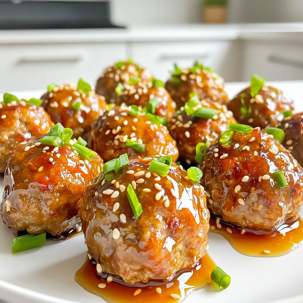 To serve, transfer the glazed meatballs to a decorative serving plate. Garnish with a sprinkle of sesame seeds and finely sliced green onions for a refreshing finish.