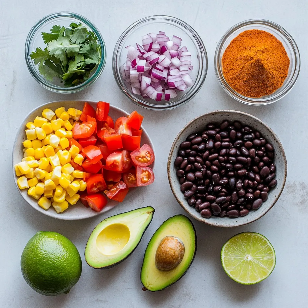 To make this salad, start by gathering your ingredients. You will need ripe avocados, black beans, cherry tomatoes, red bell pepper, red onion, corn, and fresh cilantro. You will also need lime juice, olive oil, ground cumin, chili powder, salt, and pepper. This salad is simple and quick, taking only about 15 minutes to prepare.