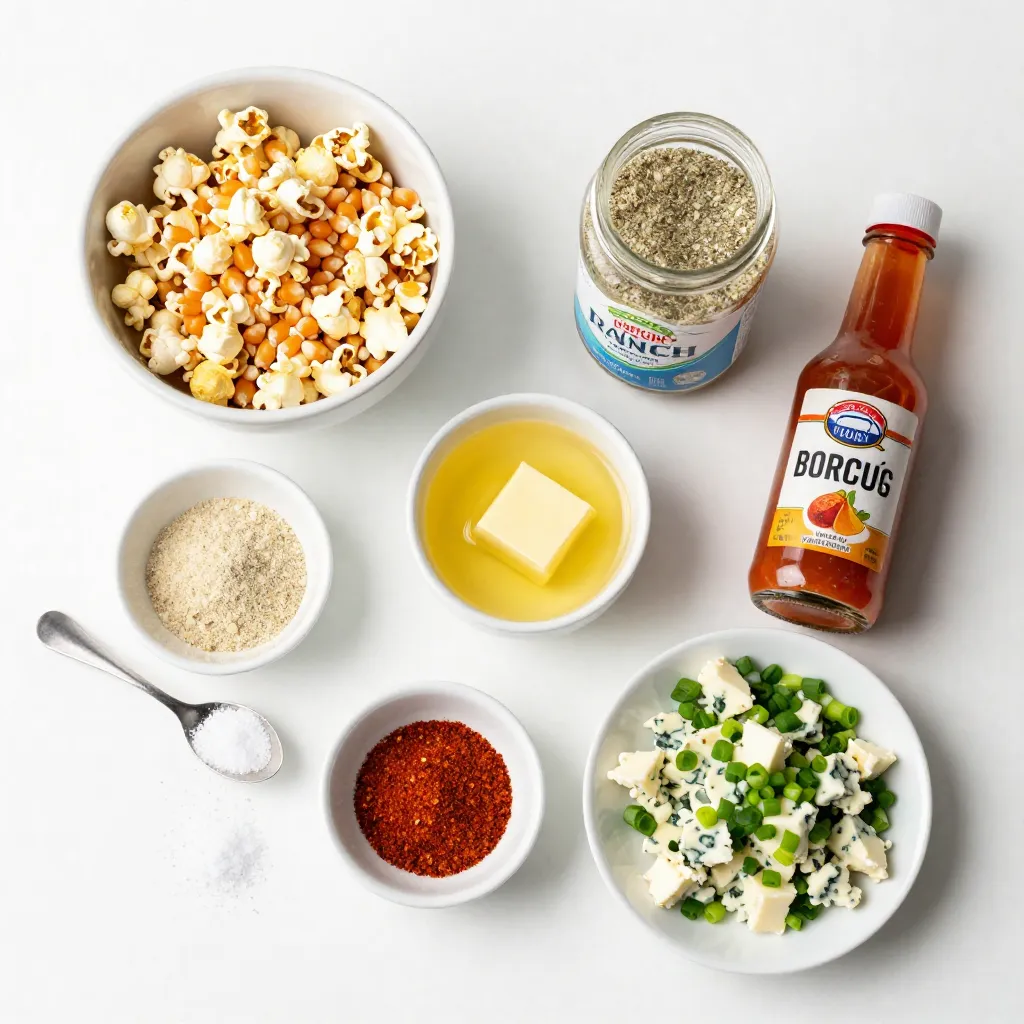 For this Buffalo Ranch Popcorn, you need simple ingredients that pack a punch. Start with unpopped popcorn kernels. They are key to getting that fluffy base. Next, we use unsalted butter. It helps the seasonings stick and adds a rich flavor.