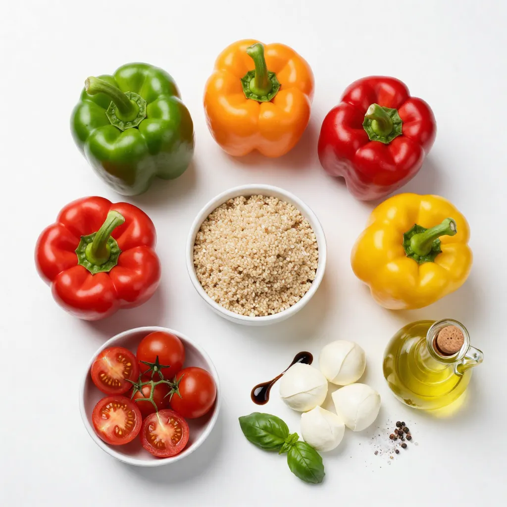 First, gather all your ingredients. This makes cooking easier. You need bell peppers, quinoa, broth, tomatoes, mozzarella, basil, balsamic glaze, olive oil, salt, and pepper. Next, preheat your oven to 375°F (190°C). This step is vital for cooking your peppers just right.
