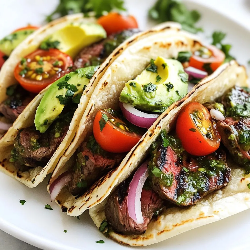 While the steak rests, warm the tortillas. Place them in a dry skillet over medium heat for about 30 seconds on each side. This makes them soft and easy to fold. To assemble your tacos, take a tortilla and add some slices of steak. Then, add halved cherry tomatoes, avocado slices, and thin red onion rings. Drizzle with the chimichurri sauce and top with fresh cilantro leaves. For a fun serving idea, put the tacos on a wooden board with lime wedges on the side. Enjoy every bite of this fresh and flavorful meal!