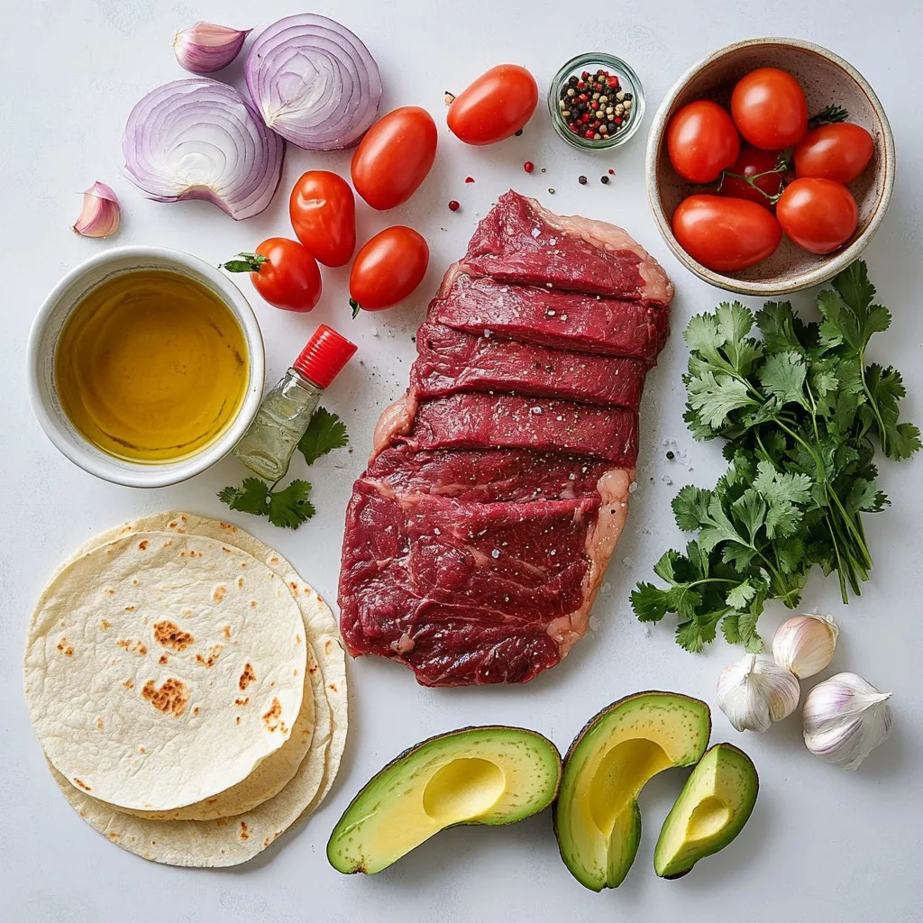 - Assemble the Tacos: On each tortilla, layer a few slices of the sliced steak, a handful of halved cherry tomatoes, a couple of avocado slices, and a scattering of thinly sliced red onion rings.