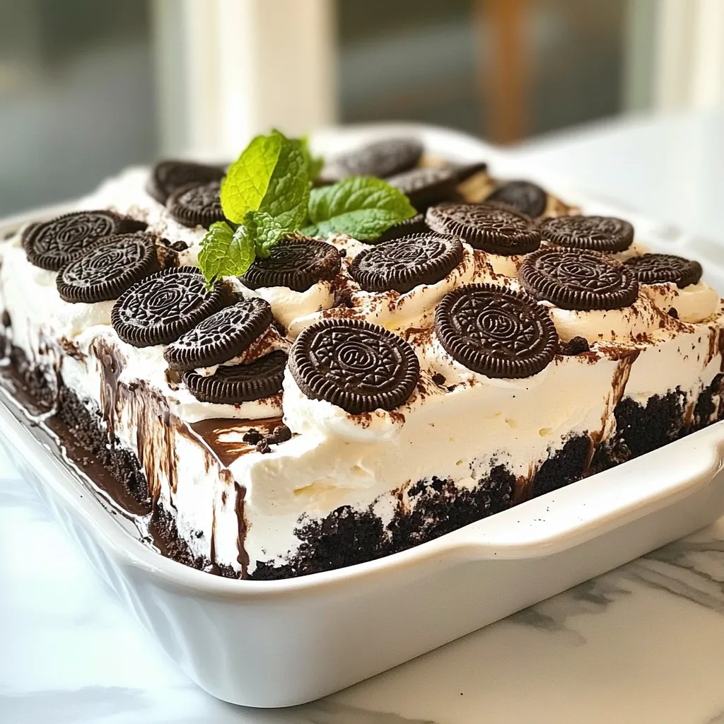 - Just before serving, sprinkle the top generously with crushed Oreos and add fresh mint leaves if desired.