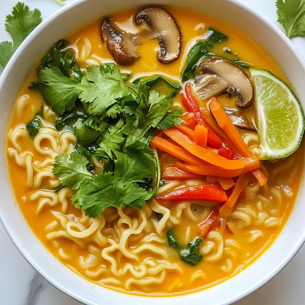 Serve coconut curry ramen hot in bowls. Garnish each bowl with fresh cilantro leaves. Add lime wedges on the side for extra zest. For crunch, sprinkle toasted sesame seeds on top. If you like heat, add crushed red pepper flakes. Pair this dish with a side of crispy spring rolls for a fun meal. Enjoy the vibrant colors and flavors!