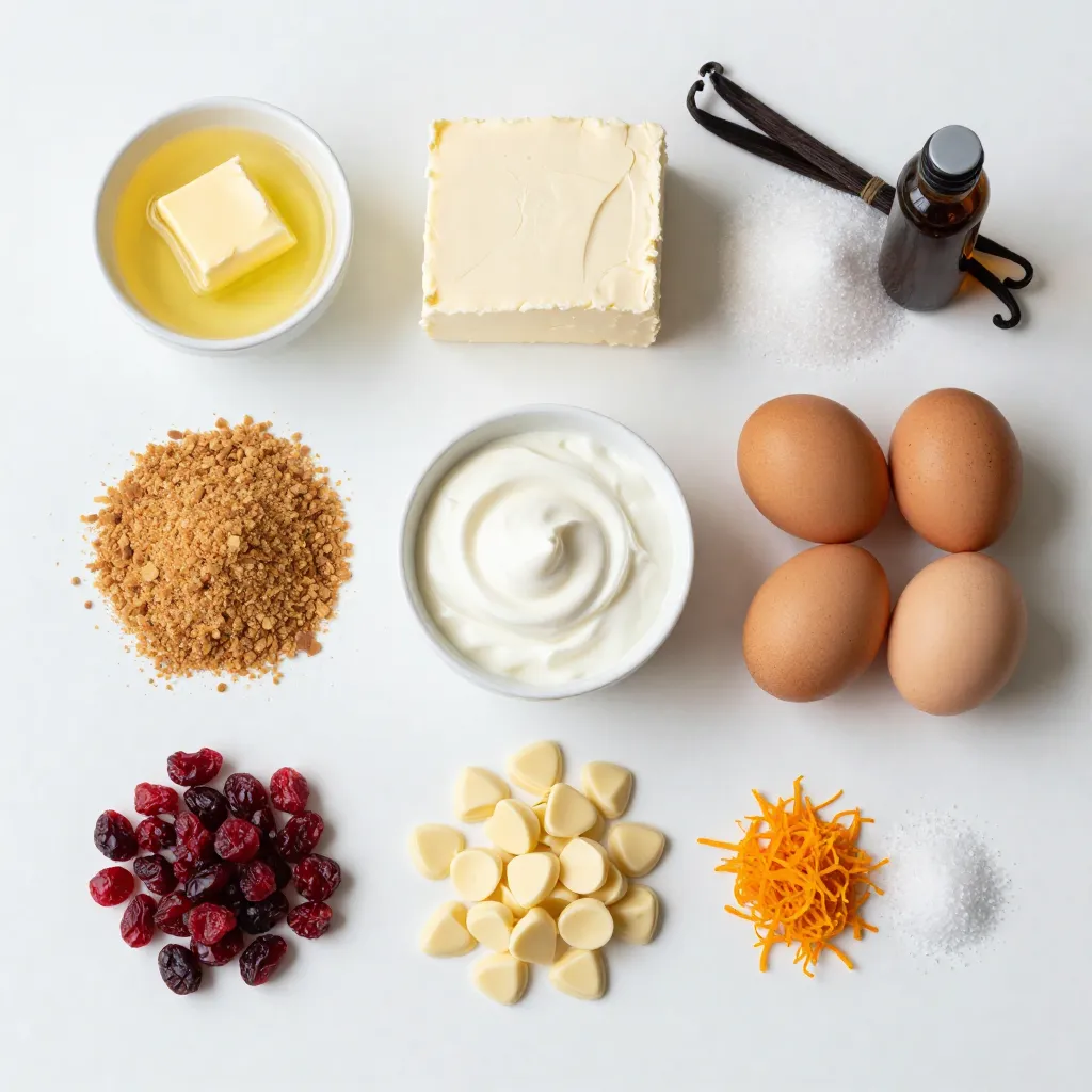 Eggs help set the cheesecake, making it firm yet smooth. Sour cream adds a tangy flavor that balances the sweetness. Dried cranberries provide bursts of tartness. White chocolate chips add a creamy touch, while orange zest infuses a refreshing citrus note. Lastly, salt enhances all these flavors.