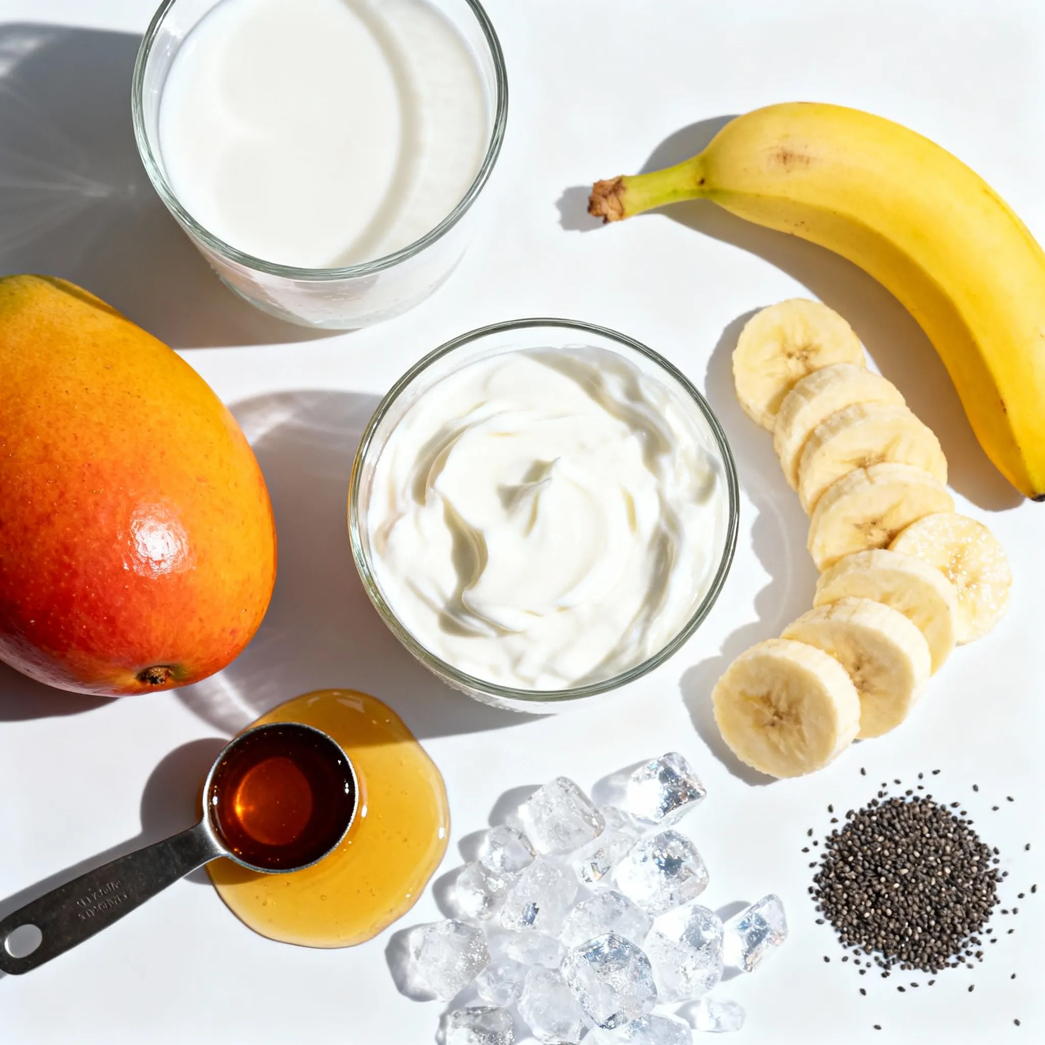 1. In a blender, combine the diced mango, coconut milk, Greek yogurt, and sliced banana.