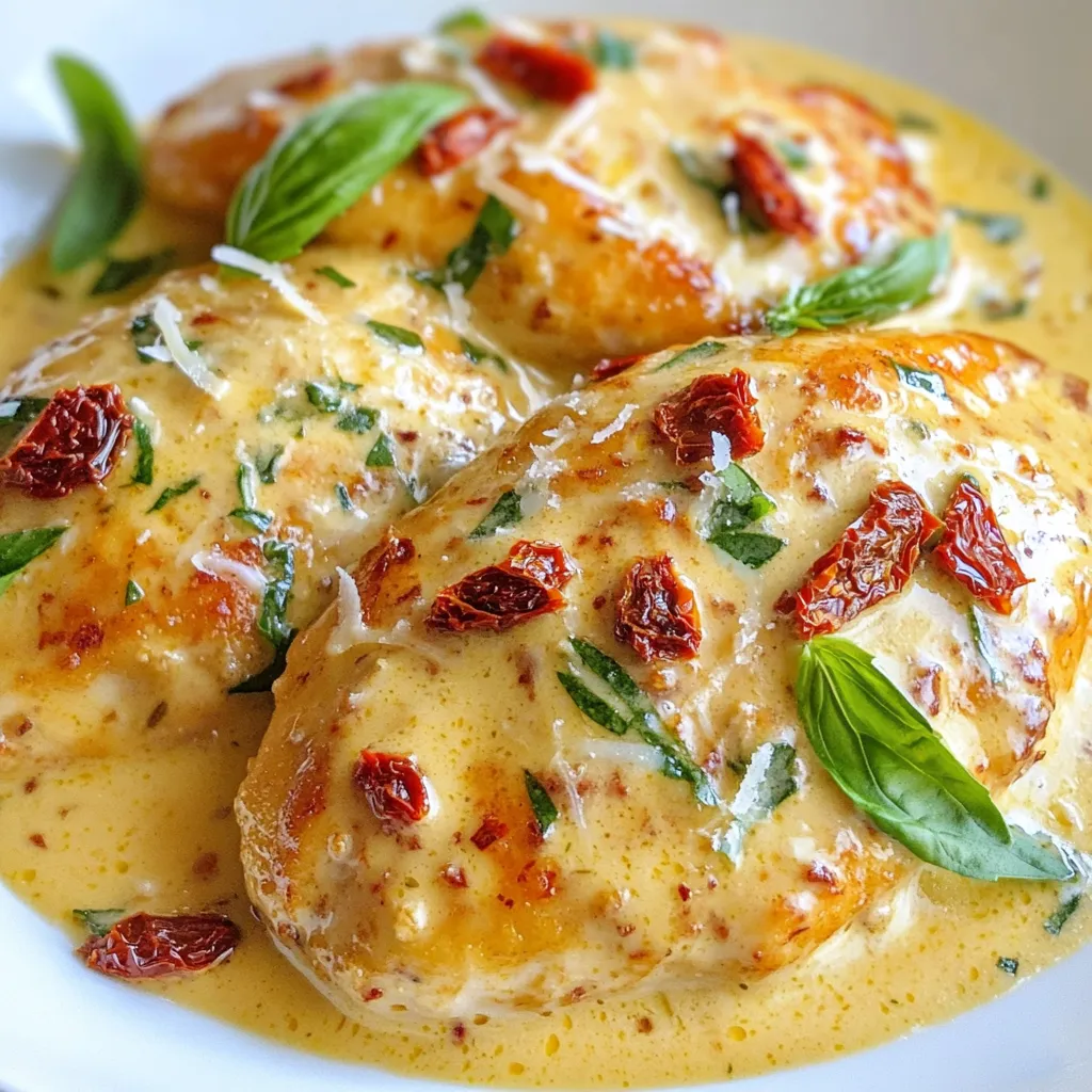 Store your creamy sun-dried tomato chicken in an airtight container. This keeps the chicken fresh. It can last in the fridge for up to three days. Make sure it cools down to room temperature before sealing. This helps avoid condensation inside the container. If you plan to eat it later, consider storing the sauce and chicken separately. This method helps keep the chicken juicy and the sauce creamy.