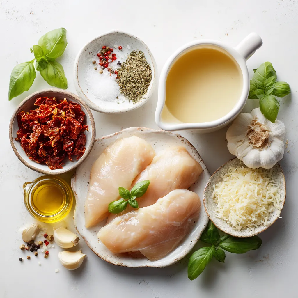 Creamy Sun Dried Tomato Chicken starts with simple, fresh ingredients. You need chicken breasts, heavy cream, and sun dried tomatoes. These add flavor and richness to the dish.