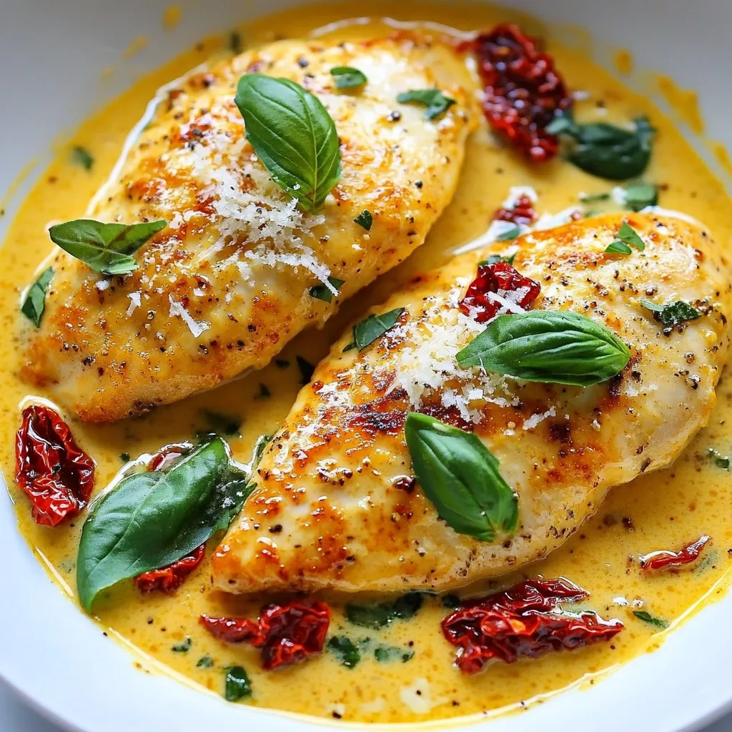 Carefully plate the chicken and drizzle the creamy sun-dried tomato sauce over the top. For a fresh touch, add some fresh basil leaves as garnish. This not only looks beautiful but also adds a burst of flavor. Enjoy your delightful meal!