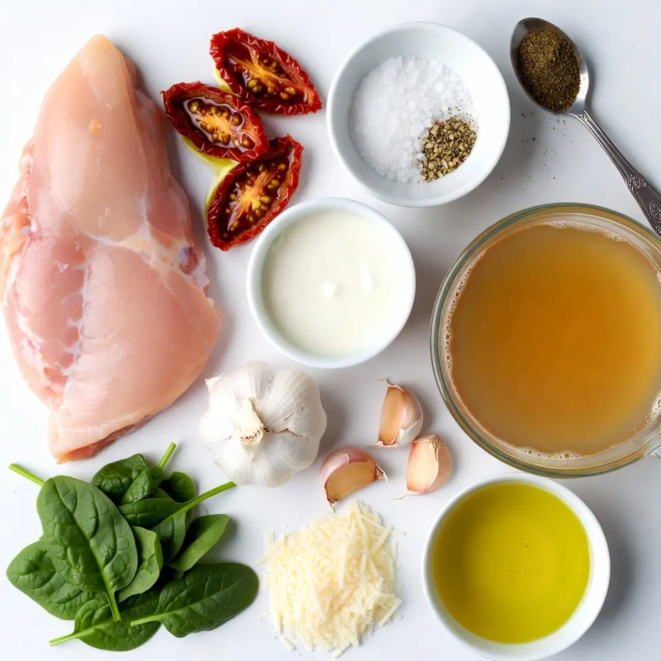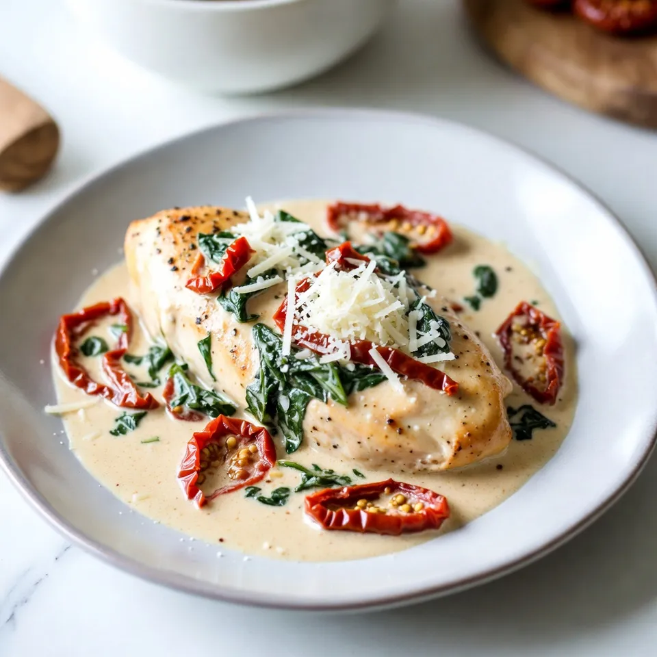 To make Creamy Sun-Dried Tomato Chicken, you will need the following items: - 2 boneless, skinless chicken breasts - 1 cup sun-dried tomatoes in oil, drained and finely chopped - 1 cup heavy cream - 1 cup chicken broth - 3 cloves garlic, minced - 1 teaspoon Italian seasoning - Sea salt and freshly cracked black pepper to taste - 2 tablespoons extra virgin olive oil - 1 cup fresh baby spinach leaves - Grated Parmesan cheese for garnishing - Optional: Fresh basil leaves for garnish These ingredients work together to create a rich and tasty meal. The sun-dried tomatoes add a sweet and tangy flavor that pairs well with chicken. The heavy cream gives the sauce its creamy texture, while the garlic and Italian seasoning add depth. You can adjust the salt and pepper to your taste. For the best results, use quality ingredients. Fresh spinach adds a nice touch, both in taste and color. Don't forget the Parmesan cheese for that extra flavor boost! {{ingredient_image_2}} First, take your chicken breasts and season them well. Use sea salt, black pepper, and Italian seasoning. This blend has dried basil, oregano, and thyme. Make sure to cover both sides evenly. This will give your chicken the best flavor. Next, heat extra virgin olive oil in a large skillet over medium-high heat. Once hot, add the seasoned chicken breasts. Sear them for about 6-7 minutes on each side. You want a nice golden-brown crust. The chicken should reach 165°F inside. When done, take the chicken out and place it on a plate. 1. Lower the heat to medium. Add minced garlic to the same skillet. Sauté it for 1 minute until it smells great. Be careful not to burn it. 2. Stir in the chopped sun-dried tomatoes. Cook them for another 2 minutes. This lets their flavor mix in well. 3. Pour in the chicken broth and stir gently. Let it simmer for about 3-4 minutes. This helps the sauce thicken. 4. Now, add the heavy cream. Stir it well until the sauce is creamy. Make sure it heats through, but do not let it boil. 5. Toss in the fresh spinach leaves. Cook for 1-2 minutes. The spinach will wilt and turn bright green. 6. Return the cooked chicken to the skillet. Spoon the creamy sauce over the chicken. Make sure each piece is fully coated. 7. Let everything simmer together for 5 more minutes. This helps the flavors blend perfectly. 8. Time to serve! Plate your creamy sun-dried tomato chicken while it is hot. Sprinkle grated Parmesan cheese on top. You can also add fresh basil leaves for extra flavor and color. To get the best chicken, use boneless, skinless breasts. Start with even seasoning. Sprinkle sea salt, black pepper, and Italian seasoning on both sides. This will help the chicken soak up flavor. Sear the chicken for 6-7 minutes on each side. Look for a golden-brown color. Make sure the inside reaches 165°F. This keeps it juicy and safe to eat. For the creamy sauce, start with sautéed garlic. This adds depth to the flavor. Add the chopped sun-dried tomatoes next. Cook them for 2 minutes. This helps the flavors mix well. Pour in chicken broth and let it simmer for 3-4 minutes. When you add heavy cream, stir gently. Keep the heat low to avoid boiling. You want it rich and creamy, not curdled. Serve your creamy sun-dried tomato chicken on a bed of fluffy jasmine rice or pasta. This makes a nice base for the sauce. Garnish with grated Parmesan cheese for a salty finish. Add fresh basil leaves for a pop of color and aroma. A drizzle of olive oil also adds shine and flavor. This makes your dish look as good as it tastes! Pro Tips Perfectly Cooked Chicken: To ensure juicy chicken breasts, use a meat thermometer to check for an internal temperature of 165°F before removing them from the skillet. Enhance the Creaminess: For a richer sauce, consider adding a tablespoon of cream cheese or mascarpone when mixing in the heavy cream. Customize the Veggies: Feel free to add other vegetables such as bell peppers or mushrooms for added flavor and texture. Leftover Magic: This dish can be easily reheated. Just add a splash of chicken broth when warming it up to keep the sauce creamy. {{image_4}} You can switch up the protein in this dish. Shrimp makes a great choice. Cook it just like the chicken. It only needs about 3-4 minutes per side. Tofu is another option. Use firm tofu for best results. Cut it into cubes, and sauté it until golden. You can also try different cuts of chicken. Thighs have more flavor and stay juicy. Want to make this dish even better? Add more herbs and spices. Fresh basil gives a nice twist. You can also try thyme or rosemary. A pinch of red pepper flakes adds heat. If you love garlic, add more cloves. For a smoky flavor, try smoked paprika. These little changes can make a big impact. You have many options for serving this dish. It pairs well with pasta. Toss it with fettuccine or penne for a hearty meal. Jasmine rice is another great choice. The creamy sauce soaks into the rice perfectly. If you prefer, serve it as a standalone dish. Just add a side salad for some freshness. Each option brings out the flavors in a new way. To store leftover creamy sun-dried tomato chicken, follow these steps: - Let the dish cool to room temperature. - Transfer it to an airtight container. - Keep it in the fridge for up to three days. - Label the container with the date to track freshness. This method keeps the chicken moist and flavorful. To reheat your creamy sun-dried tomato chicken, do this: - Place the chicken in a skillet over low heat. - Add a splash of chicken broth or cream to prevent drying. - Heat for about 5-7 minutes, stirring gently. This keeps the chicken creamy and prevents it from becoming tough. To freeze creamy sun-dried tomato chicken, use these tips: - Allow the dish to cool completely first. - Portion it into freezer-safe containers. - Seal tightly and label with the date. You can freeze it for up to three months. Thaw overnight in the fridge for the best results. Creamy sun-dried tomato chicken lasts about 3 to 4 days i