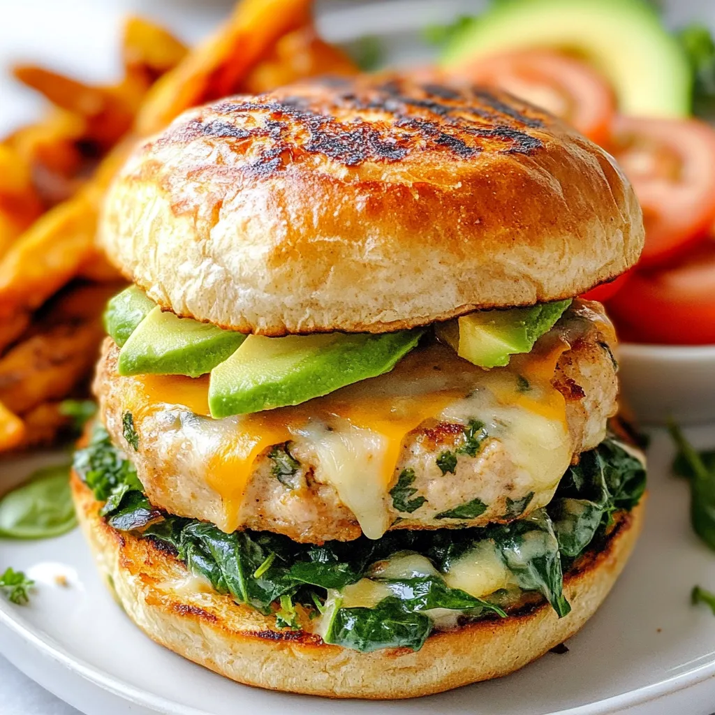 - 1 pound ground chicken - 1 cup fresh spinach, very finely chopped - 1 cup white cheddar cheese, grated - 1/2 cup panko breadcrumbs - 1/4 cup green onions, thinly sliced - 1 tablespoon garlic powder - 1 teaspoon onion powder - 1 teaspoon sea salt - 1/2 teaspoon freshly ground black pepper - 1 tablespoon olive oil (for cooking) - 4 whole wheat burger buns - Optional toppings: slices of avocado, fresh lettuce leaves, tomato slices, and mayonnaise To make these burgers, I gather all the key ingredients first. The ground chicken acts as the base, giving us juicy patties. Fresh spinach adds a nice touch of color and nutrition. I love using white cheddar cheese because it melts so well and adds great flavor. Panko breadcrumbs give the burgers a delightful crunch. Next, I slice the green onions for a fresh bite. Garlic powder and onion powder boost the flavor, making each bite tasty. I always season with sea salt and black pepper to bring everything together. For cooking, I use olive oil to keep the patties from sticking. Whole wheat burger buns add a wholesome touch. I often add toppings like creamy avocado, crisp lettuce, juicy tomatoes, and a dollop of mayonnaise to complete the meal. These ingredients transform the burgers into a delicious feast. {{ingredient_image_2}} To start, grab a large mixing bowl. In it, combine the following ingredients: - 1 pound ground chicken - 1 cup fresh spinach, very finely chopped - 1 cup white cheddar cheese, grated - 1/2 cup panko breadcrumbs - 1/4 cup green onions, thinly sliced - 1 tablespoon garlic powder - 1 teaspoon onion powder - 1 teaspoon sea salt - 1/2 teaspoon freshly ground black pepper Use a spatula or your hands to mix these items gently. Make sure to blend them well. You want all the ingredients to be evenly mixed. Avoid overworking the chicken to keep it tender. Next, divide the mixture into four equal parts. Each part should be about the same size for even cooking. Form each portion into a patty that is about 1/2 inch thick. This thickness helps the burgers cook properly. Uniform patties ensure all cook at the same rate. Now, heat a large skillet over medium heat. Add 1 tablespoon of olive oil to the pan. Wait until the oil shimmers before adding the patties. Make sure not to overcrowd the skillet. Cook each patty for about 5-6 minutes on one side. Flip the patties and cook for the same time on the other side. The burgers are ready when their internal temperature reaches 165°F (75°C) and they have a nice golden-brown crust. In the last minute of cooking, place a slice of white cheddar on each patty. Let it melt perfectly before serving. This adds a creamy finish to your burgers. To get the best burgers, avoid overcrowding the skillet. This keeps the heat steady and helps the patties cook evenly. If you add too many at once, they may steam instead of sear. Cook in batches if needed. Checking the internal temperature is key. Use a meat thermometer to make sure the chicken reaches 165°F (75°C). This ensures the burgers are safe to eat and juicy. Layering ingredients is important for great flavor. Start with the chicken patty on the bottom. Next, add toppings like creamy avocado, crisp lettuce, and juicy tomato. Finish with a dollop of mayonnaise for extra richness. Toasting the buns adds a nice crunch. Toast them in a dry skillet or under the broiler until golden brown. This not only adds texture but also helps prevent sogginess from the toppings. For serving suggestions, pair the burgers with sweet potato fries. This adds color and flavor to your plate. Garnish with a sprig of parsley for a fresh touch. For a rustic look, wrap each burger in parchment paper. This gives a casual and fun vibe, perfect for gatherings or picnics. It keeps everything together while adding charm to your meal. Pro Tips Keep it Fresh: Always use fresh spinach for the best flavor and texture in your burgers. Frozen spinach can be used, but make sure to squeeze out excess moisture to avoid sogginess. Uniform Patties: Shape your patties uniformly to ensure even cooking. This helps avoid undercooked centers or overcooked edges. Let it Rest: After cooking, let the patties rest for a few minutes before assembling the burgers. This helps the juices redistribute, resulting in a juicier bite. Experiment with Toppings: Don't hesitate to customize your burger with different toppings like jalapeños for heat, or a dollop of Greek yogurt for creaminess instead of mayonnaise. {{image_4}} You can change the cheese in these burgers. If you want, try mozzarella or gouda. Each cheese brings its own flavor. You can also swap out the ground chicken. Use turkey or lean beef as alternatives. Each option gives a different taste and texture. Want to spice things up? Add your favorite spices. Paprika or cayenne can bring heat. Fresh herbs can also boost the flavor. Try basil or parsley for a fresh touch. For garnishes, use colorful toppings. Fresh tomatoes or pickles can make the burger pop. A sprinkle of sesame seeds on top adds a nice look too. If you're gluten-free, use gluten-free breadcrumbs. This keeps the texture without the gluten. For a vegetarian option, replace the chicken with chickpeas or black beans. Mash them up and mix with the other ingredients. This way, you still enjoy a tasty burger without meat. You can store cooked patties in an airtight container. Make sure to let them cool first. These burgers stay fresh for up to four days in the fridge. Always label the container with the date. This way, you know how long they’ve been stored. To freeze, wrap each patty tightly in plastic wrap. Then, place them in a freezer bag. This helps prevent freezer burn. You can freeze the patties for up to three months. When ready to eat, thaw them in the fridge overnight. For reheating, bake them in the oven at 350°F for 15-20 minutes. This keeps them juicy and warm. You can repurpose leftover patties in many ways. Chop them up and toss them in a salad for extra protein. You can also 