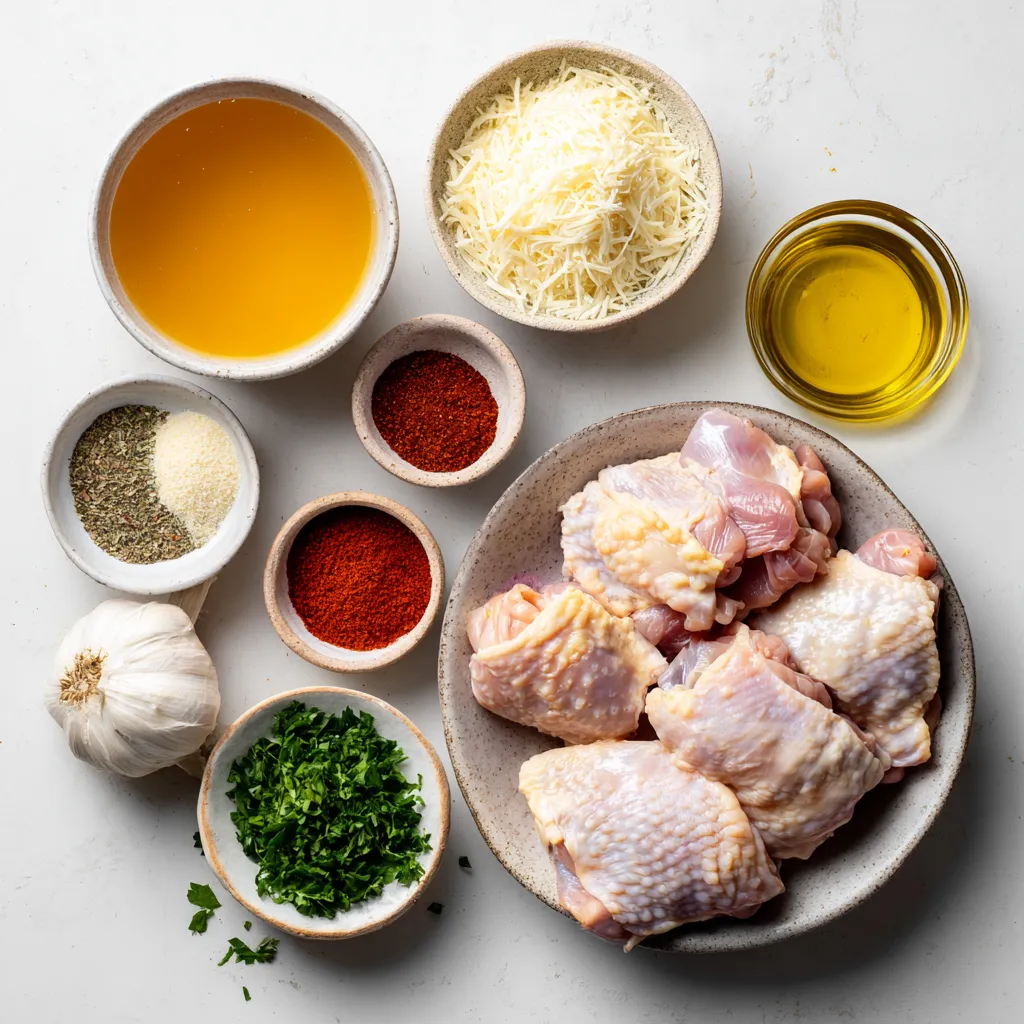 Start with fresh chicken thighs. Place them in the crockpot. Next, heat the olive oil in a medium skillet over medium heat. Add the minced garlic and sauté it for 1-2 minutes. You want it fragrant but not brown. Browning garlic can make it taste bitter. Now, in a bowl, mix the chicken broth, grated Parmesan, Italian seasoning, paprika, black pepper, and salt. Whisk until smooth. Pour this mixture over the chicken in the crockpot. Make sure each piece is covered in the sauce.