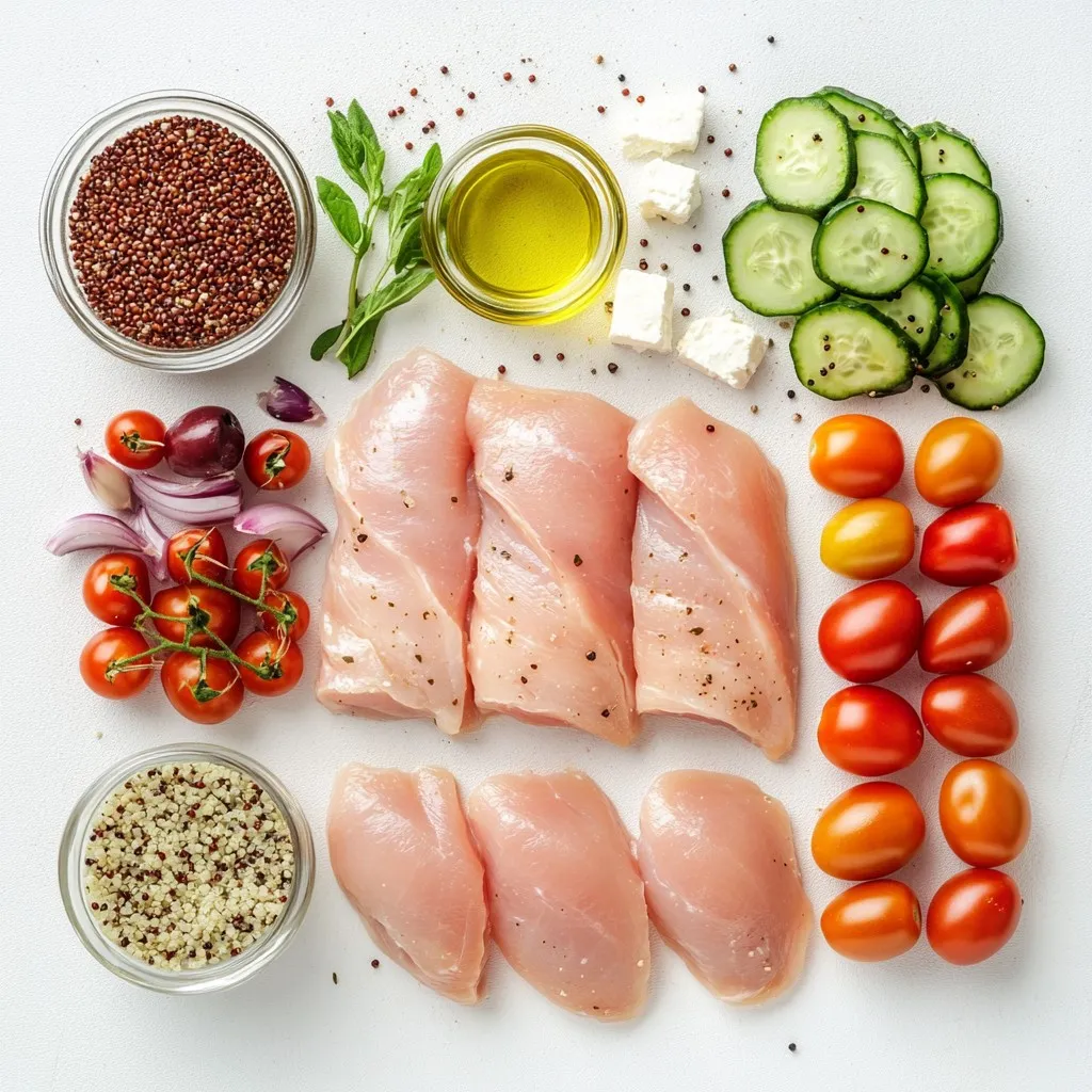 The chicken breast is the star of this dish. I like to slice it thin for quick cooking. Olive oil adds healthy fat and flavor. Greek oregano gives a bold taste that stands out. Garlic powder and onion powder add depth. Quinoa acts as a nutty base. It is rich in protein and gluten-free. Cherry tomatoes provide sweetness and color. Cucumber adds crunch and freshness. Red onion gives a nice bite. Feta cheese brings creaminess and saltiness. Kalamata olives add a briny punch. Tzatziki sauce is cool and tangy, perfect for drizzling. Finally, parsley adds a fresh touch.