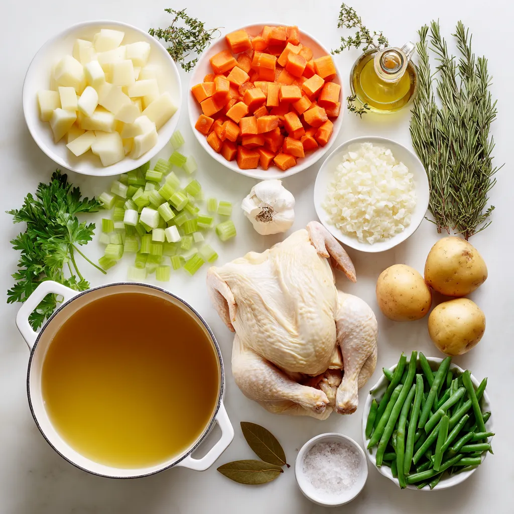 First, gather your ingredients. You need a whole chicken, carrots, celery, onion, garlic, green beans, and potatoes. Cut your vegetables into small pieces. Dice the carrots and celery. Chop the onion finely. Mince the garlic. This prep makes your soup tasty and colorful.