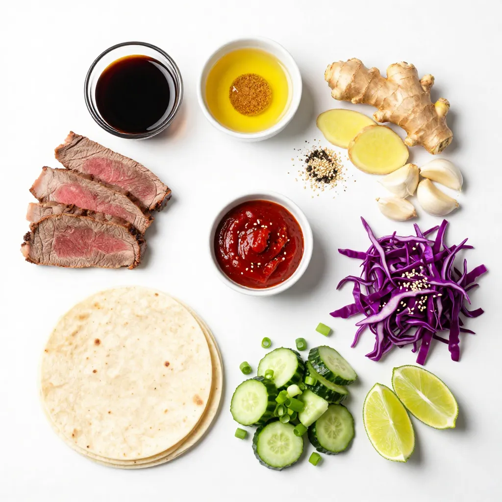 To assemble your tacos, place a good amount of cooked beef in the center of a warm tortilla. Top it with a handful of shredded purple cabbage, diced cucumber, and chopped green onions. For the final touch, sprinkle sesame seeds on top and add a squeeze of fresh lime juice. Enjoy!