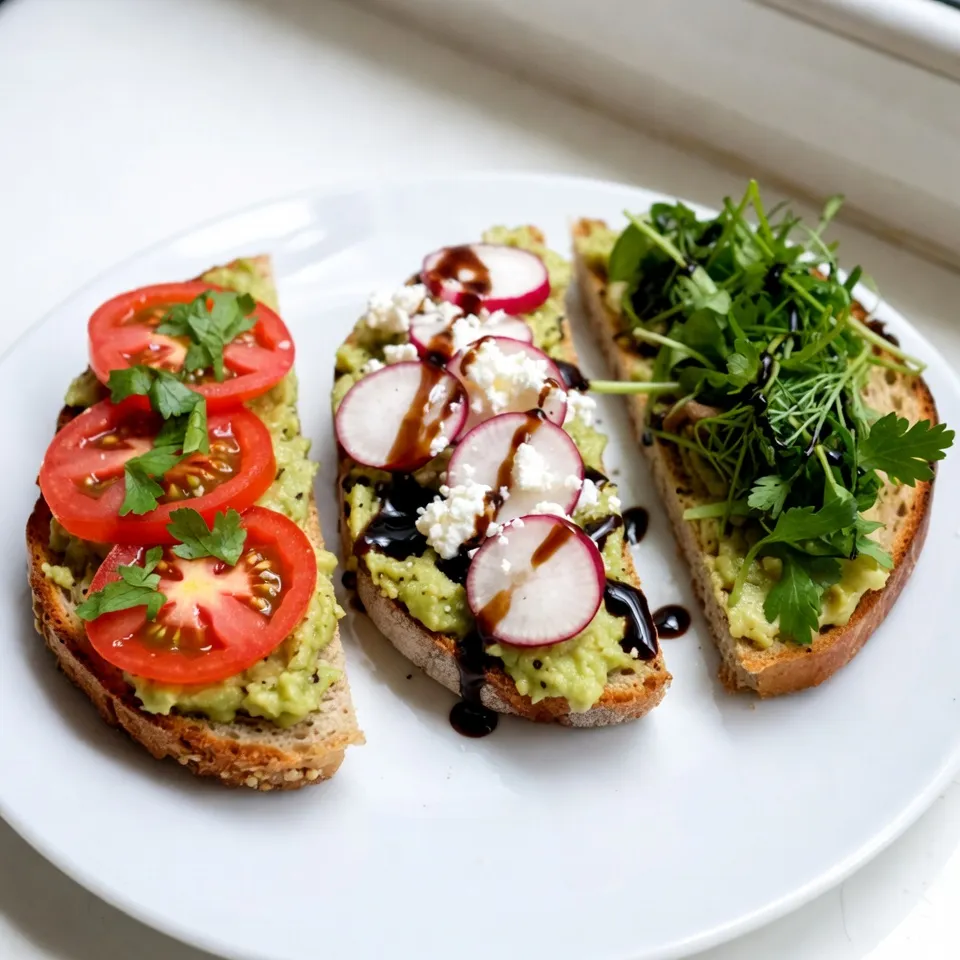 - Assemble the Toasts: On one slice of the toasted bread, spread a generous layer of the seasoned avocado mash. Top with the sliced tomato, a light sprinkling of extra salt, and a few fresh herb leaves for added color and flavor. For the second slice, layer it with the avocado mixture, top with the thin radish slices, crumbled feta cheese, and finish with a drizzle of balsamic glaze. For the third slice, spread a thick layer of the mashed avocado, then generously garnish with a mix of fresh herbs. Adjust the seasoning with an additional pinch of salt if you prefer more flavor.