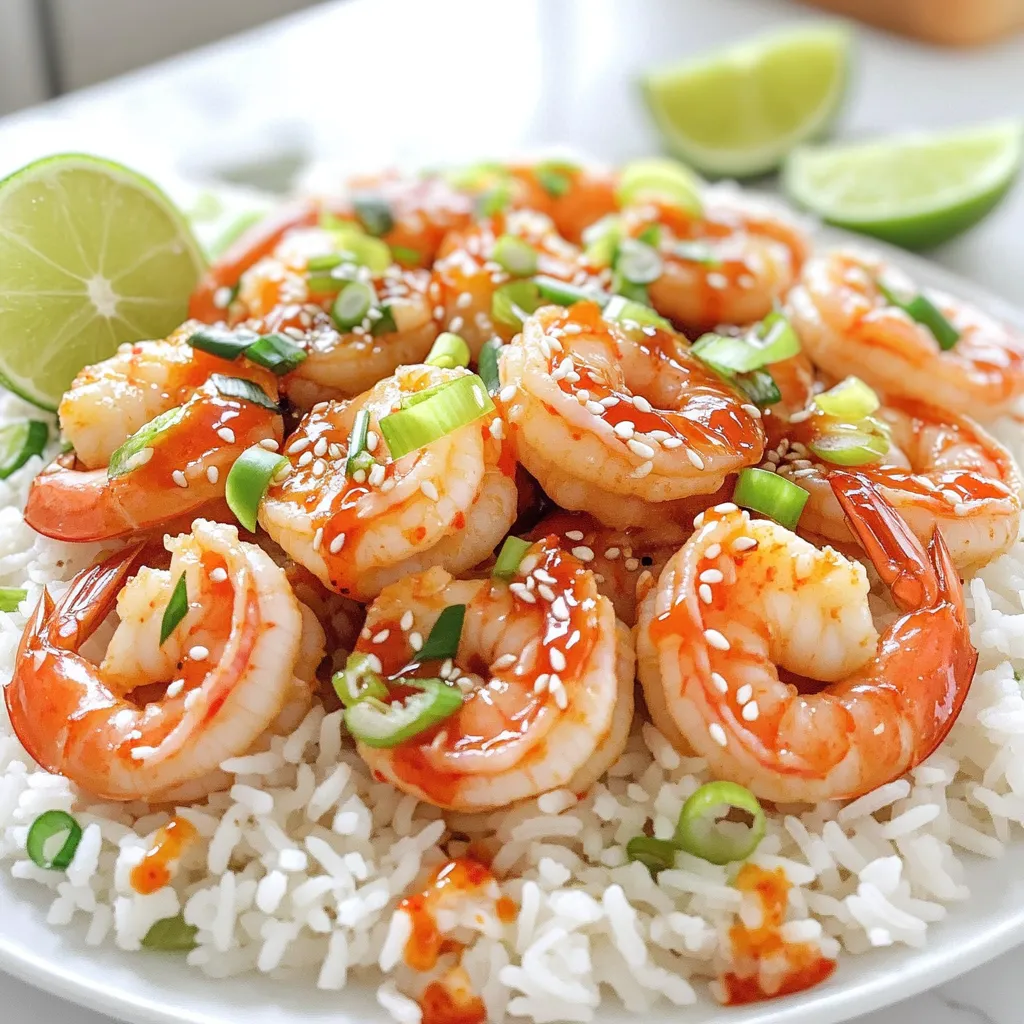 Once the shrimp are done, remove the pan from heat. Stir in the sliced green onions for a fresh crunch. To serve, place the shrimp over warm jasmine rice. Don’t forget to sprinkle sesame seeds on top. This adds a nice touch and extra crunch. For a final flair, drizzle a little extra sweet chili sauce over the shrimp. Enjoy your delicious meal!