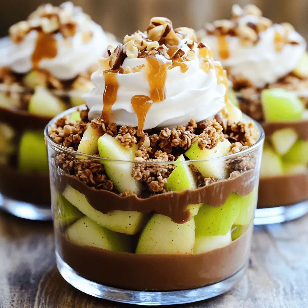If your cups are tall enough, you can repeat the layers. Start with another round of granola, then another layer of chocolate pudding. Finish with more cinnamon-coated apples and a drizzle of caramel sauce. This creates a beautiful, layered look that is very appetizing.