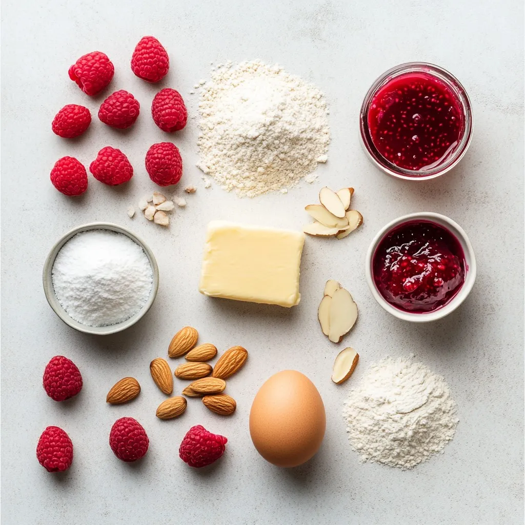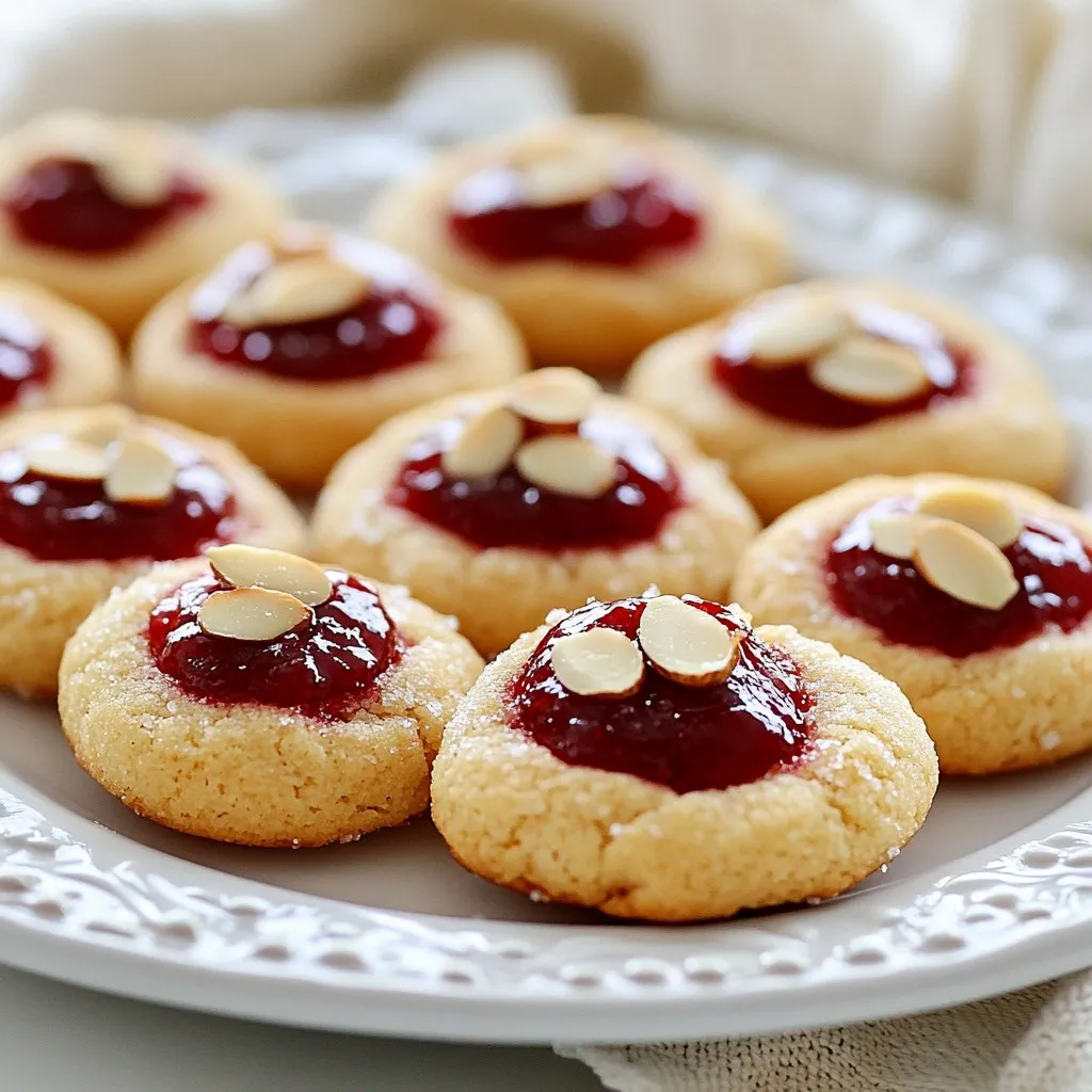 To make Raspberry Almond Thumbprint Cookies, gather these items: - 1 cup unsalted butter, softened to room temperature - 1 cup granulated sugar - 1 large egg - 1 teaspoon pure vanilla extract - 2 cups all-purpose flour - 1 cup almond flour - 1/2 teaspoon fine sea salt - 1/4 teaspoon baking powder - 1/2 cup raspberry jam (or your favorite variety) - 1/2 cup sliced almonds, for topping Baking these cookies requires a few key tools: - Electric mixer: This helps cream the butter and sugar well. - Mixing bowls: You’ll need one for wet ingredients and one for dry. - Baking sheets: These hold the cookies while they bake. - Parchment paper: This prevents sticking and makes cleanup easy. You can switch some ingredients if needed: - Instead of unsalted butter, use coconut oil for a dairy-free option. - For almond flour, sunflower seed flour works well if you have nut allergies. - You may replace raspberry jam with any berry jam you like, such as strawberry or blueberry. - If you want a sweeter cookie, consider adding a bit more sugar. These simple swaps let you customize the cookies to fit your taste or dietary needs. Enjoy baking! {{ingredient_image_2}} Start by preheating your oven to 350°F (175°C). This step is key for even baking. While the oven heats, line two baking sheets with parchment paper. This helps prevent your cookies from sticking. In a large bowl, add 1 cup of softened unsalted butter and 1 cup of granulated sugar. Use an electric mixer on medium speed. Beat this mixture until it turns light and fluffy. This should take about 3-4 minutes. Next, crack in 1 large egg and pour in 1 teaspoon of pure vanilla extract. Mix again until everything is smooth. In a separate bowl, measure and whisk together 2 cups of all-purpose flour, 1 cup of almond flour, 1/2 teaspoon of fine sea salt, and 1/4 teaspoon of baking powder. Mixing these dry ingredients well ensures that the cookies rise evenly. Gradually add the dry mixture to the wet mixture. Stir on low speed until you just combine them. Be careful not to overmix; a few flour streaks are fine. Now, use your hands to scoop dough and roll it into small balls, about 1 inch wide. Place these balls on the prepared baking sheets, leaving about 2 inches between each. Next, make an indentation in each ball using your thumb. This is where the jam will go later. Spoon a small amount of raspberry jam into each thumbprint. Be careful not to fill them too much, or the jam will bubble over while baking. Finally, sprinkle sliced almonds on top of each cookie. Bake the cookies in your preheated oven for 12-15 minutes. Watch closely; they are ready when the edges turn a light golden brown. Once baked, let the cookies cool on the sheets for 5 minutes before transferring them to a wire rack to cool completely. Enjoy your delicious treats! To get the best texture, start with softened butter. This helps the cookies become light and fluffy. Cream the butter and sugar together until they look pale and fluffy. This process adds air, making the cookies tender. Make sure to mix the dough just enough. Overmixing can make cookies tough. You want a soft dough that holds its shape when you roll it. One common mistake is not measuring flour correctly. Too much flour makes cookies dry. Use a spoon to fill your measuring cup, then level it off. Another mistake is overfilling the jam. Only add a small amount into each thumbprint. If you add too much, the jam can overflow and burn. Lastly, keep an eye on the baking time. Cookies can go from perfect to overbaked quickly. When filling the cookies, use a spoon or small scoop. This helps control the amount of jam. Always fill the indentations just to the top. If you want a burst of flavor, try different jams. Strawberry or apricot also work well. For a fun twist, mix some almond extract into the jam for added flavor. Pro Tips Chill Your Dough: If the dough feels too soft or sticky, refrigerate it for 30 minutes before rolling. This helps maintain the shape during baking. Use Quality Jam: Opt for a high-quality raspberry jam for the best flavor. You can also experiment with other fruit jams like apricot or strawberry. Watch the Bake Time: Baking times can vary by oven, so start checking the cookies at the 10-minute mark to prevent overbaking. Storage Tips: Store cookies in an airtight container at room temperature. They last up to a week, but they’re best enjoyed fresh! {{image_4}} You can switch up the jam for more fun! Here are some great choices: - Strawberry jam - Apricot jam - Cherry jam - Blueberry jam - Orange marmalade Each jam brings a new twist. Strawberry jam gives a sweet touch. Apricot adds a fruity zing. Cherry and blueberry jams offer a burst of flavor. Orange marmalade gives a citrus kick. These options can make each bite special. Want to change the almond flavor? You can. Try these ideas: - Use almond extract instead of vanilla. - Toss in some almond paste for richer taste. - Mix in chopped nuts like hazelnuts or walnuts for crunch. These changes can enhance the cookie’s flavor. You will enjoy new tastes while keeping the base recipe. If you need a gluten-free cookie, it’s easy! Just follow these steps: - Swap the all-purpose flour with gluten-free flour. - Make sure the baking powder is also gluten-free. - Check that the jam does not contain gluten. Using almond flour in the recipe helps too. These tweaks let everyone enjoy the cookies. You won’t miss the gluten at all! To keep your Raspberry Almond Thumbprint Cookies fresh, use an airtight container. Place layers of cookies between sheets of parchment paper. This helps to prevent sticking and keeps them soft. Store at room temperature for up to one week. For longer storage, consider freezing. To freeze these cookies, first ensure they are completely cool. Place them on a baking sheet in a single layer. Freeze for about two hours. Once frozen, transfer them to a freezer-safe bag or container. They can stay in the freezer for up to three months. Label t