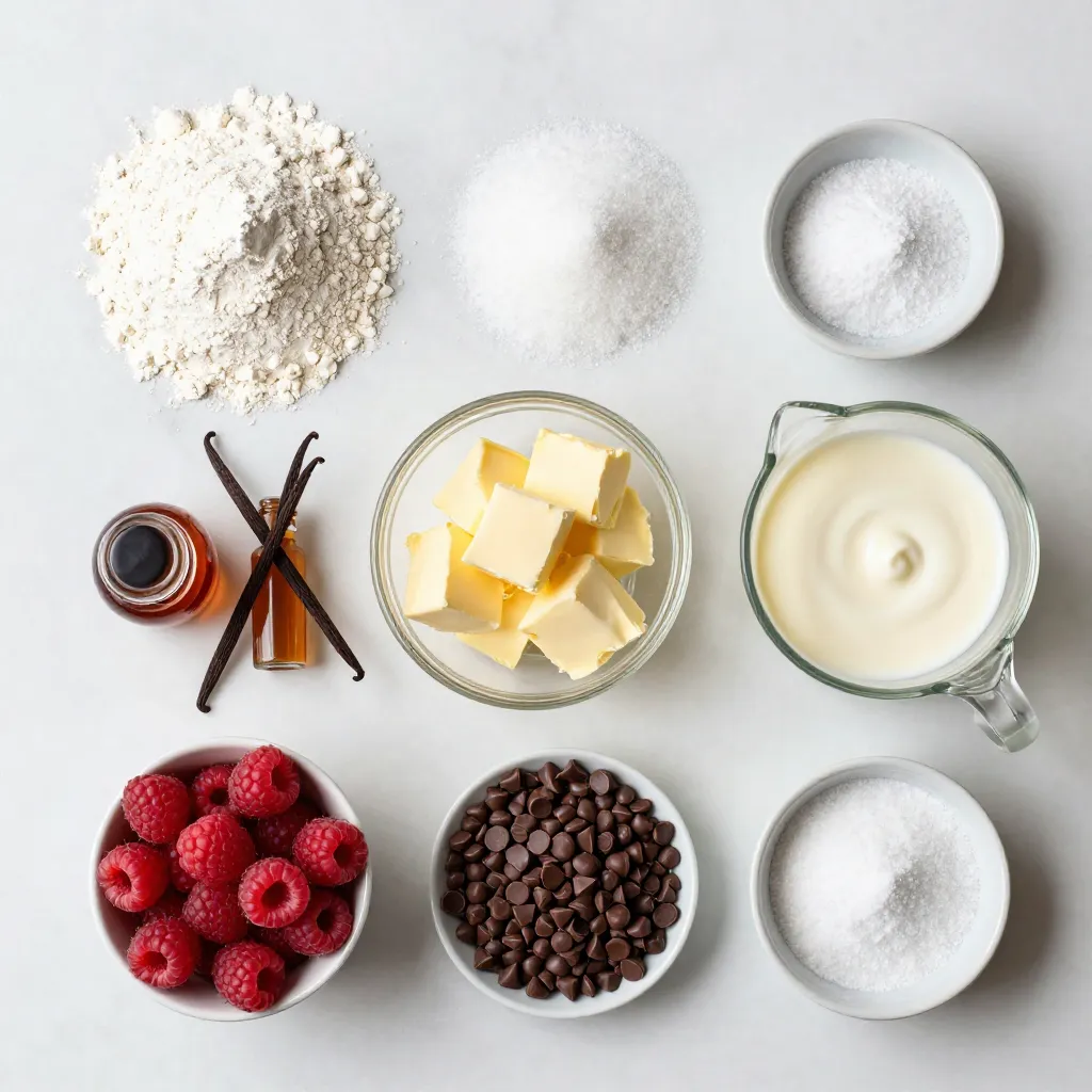 For the dry mix, gather these items: - 2 cups all-purpose flour - 1/4 cup granulated sugar - 1 tablespoon baking powder - 1/2 teaspoon sea salt These ingredients form the base of your scones. The flour gives structure, while the sugar adds sweetness. Baking powder makes them rise. Sea salt enhances flavor. Now, for the wet mix, you need: - 3/4 cup heavy cream - 1 teaspoon pure vanilla extract - 1/2 cup unsalted butter, cold and cut into small cubes The heavy cream and vanilla make the scones rich and moist. Cold butter adds flakiness. It is key to keep the butter cold until mixing. Finally, gather these extras: - 1 cup fresh raspberries, rinsed and drained - 1/2 cup semi-sweet chocolate chips - Extra granulated sugar for sprinkling on top Fresh raspberries add a tart burst of flavor. Chocolate chips add sweetness and richness. A sprinkle of sugar on top creates a nice crunch when baked. {{ingredient_image_2}} First, set your oven to 400°F (200°C). This is the perfect temperature for baking. While it heats, line a baking sheet with parchment paper. This helps prevent sticking. You want your scones to bake evenly. In a large bowl, mix the dry ingredients. Add 2 cups of all-purpose flour, 1/4 cup of granulated sugar, 1 tablespoon of baking powder, and 1/2 teaspoon of sea salt. Sift them together well. This step ensures your scones are light and fluffy. Now, take 1/2 cup of cold, cubed unsalted butter. Add it to the dry mix. Use your fingertips or a pastry cutter to blend it. You want the mixture to look like coarse crumbs. Keep some small butter pieces for a flaky texture. In a separate bowl, whisk together 3/4 cup of heavy cream and 1 teaspoon of pure vanilla extract. Mix until well combined. Slowly pour this into the dry mixture. Stir gently with a wooden spoon. Do not overmix; just combine until the dough forms. Next, fold in 1 cup of fresh raspberries and 1/2 cup of semi-sweet chocolate chips. Be gentle to avoid breaking the berries. You want them evenly spread throughout the dough for sweet bites in every scone. Turn the dough onto a floured surface. Knead it just enough to form a ball. Then, pat it into a disk about 1 inch thick. Use a sharp knife or pizza cutter to slice it into 8 wedges. Place these on the baking sheet, leaving space between them. Sprinkle extra sugar on top of each scone. This gives a nice, sweet crust. Bake the scones for 15-20 minutes. They should turn golden brown. Check with a toothpick; it should come out clean. Let them cool on the baking sheet for 5 minutes before moving to a rack. To make flaky scones, start with cold butter. Cut it into small cubes. When you mix it with the flour, keep it chunky. This helps create those light layers. Use your fingertips to work the butter into the flour. You want a crumbly look, not a smooth dough. When adding raspberries and chocolate chips, fold gently. Use a spatula or wooden spoon. This keeps the berries whole and juicy. If you stir too hard, the raspberries will break. You want to keep them intact for bursts of flavor. Set your oven to 400°F (200°C). This high heat helps the scones rise quickly. Bake them for 15 to 20 minutes. Look for a golden color on top. A toothpick inserted should come out clean. This means they're done! Enjoy the warm scent in your kitchen as they bake. Pro Tips Use Cold Ingredients: Ensure your butter and cream are cold before mixing. This helps create a flaky texture in the scones. Don't Overmix: Mix the dough gently and stop as soon as it comes together. Overmixing can result in tough scones. Fresh Berries: Using fresh raspberries is key for flavor and texture. Frozen berries can make the dough soggy. Watch the Baking Time: Keep an eye on your scones while they bake. Remove them from the oven as soon as they are golden brown to prevent drying out. {{image_4}} You can swap raspberries for other berries. Blueberries, strawberries, or blackberries work great. Each berry brings its own flavor. Blueberries add sweetness, while strawberries give a fresh twist. Just keep the same amount of berries. Make sure to wash and dry them well before mixing. Try using different types of chocolate. Milk chocolate chips add a sweet touch. Dark chocolate gives a rich, bold flavor. You can even use white chocolate for a creamy taste. Mix and match to find your favorite combo. Remember to adjust the amount to not overpower the berries. If you need gluten-free scones, use gluten-free flour. Many brands work well in baking. Combine it with a gluten-free baking powder for the best results. You might also need to add a bit more liquid. Keep an eye on the dough texture while mixing. This way, you can still enjoy these tasty scones! To keep your scones fresh, you should store them in an airtight container. Place a piece of parchment paper between layers to avoid sticking. This will help them stay soft. Keep the container at room temperature for up to two days. If you want to keep them longer, consider freezing. Freezing is a great option for scones. First, let the scones cool completely. Then, wrap each scone in plastic wrap. Place the wrapped scones in a freezer-safe bag or container. They can last up to three months in the freezer. When you’re ready to enjoy them, just take out how many you need. To reheat scones, preheat your oven to 350°F (175°C). Place the scones on a baking sheet. Heat them for about 10 minutes or until warm. You can also microwave them for about 20 seconds. However, the oven gives a better texture. Enjoy your scones warm for the best flavor! Yes, you can use frozen raspberries. They work well in this recipe. Just remember to thaw and drain them first. This helps prevent excess moisture in your scones. If you add them straight from the freezer, they might make the dough too wet. You will know the scones are done when they turn golden brown. A toothpick inserted in the center should come out clean. Bake them for about 15 to 20 minutes. Keep an eye on them toward the end to avoid burning. Th