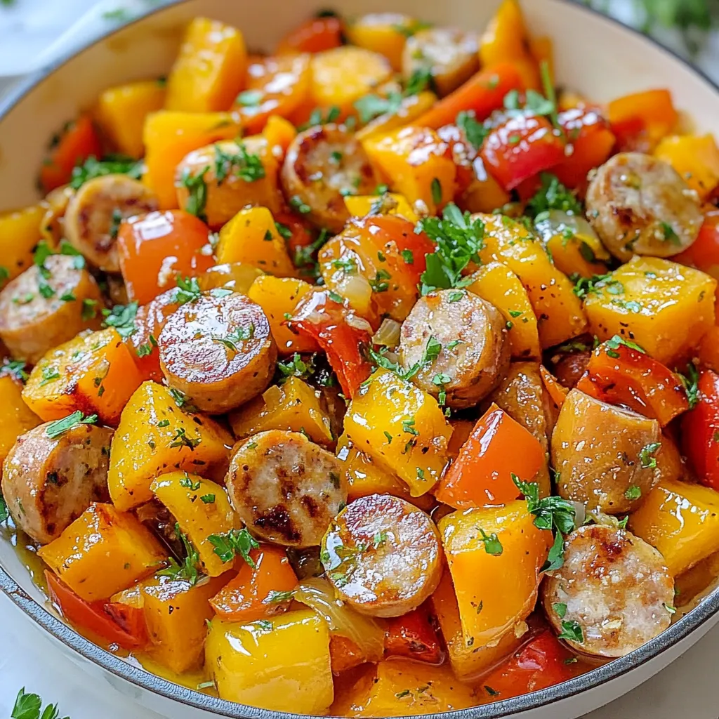 - 2 medium sweet potatoes, peeled and diced into 1-inch cubes - 1 pound chicken or turkey sausage, sliced into rounds - 3 tablespoons honey - 4 cloves garlic, minced finely - 1 red bell pepper, diced - 1 yellow bell pepper, diced - 1 small red onion, chopped - 2 tablespoons olive oil - 1 teaspoon smoked paprika - 1/2 teaspoon salt - 1/4 teaspoon black pepper - Fresh parsley, chopped (for garnish) For this dish, you need to start with fresh ingredients. Use 2 medium sweet potatoes. Peel and cut them into 1-inch cubes for even cooking. Grab 1 pound of chicken or turkey sausage. Slice it into rounds for nice bites. Next, gather 3 tablespoons of honey. This will bring a lovely sweetness. You need 4 cloves of garlic, minced finely. This adds flavor. You will also need 1 red bell pepper and 1 yellow bell pepper. Dice them for color and crunch. For the base, use 1 small red onion, chopped. Prepare 2 tablespoons of olive oil. This helps cook the veggies and sausage. Add 1 teaspoon of smoked paprika, 1/2 teaspoon of salt, and 1/4 teaspoon of black pepper for seasoning. Finally, have fresh parsley ready. It’s great for garnish and adds a fresh touch. If you want to swap the sausage, try using plant-based sausage for a vegetarian dish. Sweet potatoes can be replaced with butternut squash or carrots if needed. If you don't have honey, maple syrup works well for sweetness. For garlic, you can use garlic powder in a pinch, but fresh is best. You can also mix in other veggies like zucchini or spinach. They will cook well and add more nutrients. This dish is flexible, so feel free to get creative with what you have! {{ingredient_image_2}} Start by heating 2 tablespoons of olive oil in a large skillet over medium heat. You want the oil to shimmer. This step helps to cook the sweet potatoes evenly. It also adds flavor to the dish. Add 2 medium sweet potatoes, peeled and diced into 1-inch cubes. Sauté them for about 5-7 minutes. Stir occasionally. You want them to soften and turn golden on the edges. This brings out their natural sweetness. Next, push the sweet potatoes to one side of the skillet. Add 1 pound of sliced chicken or turkey sausage to the empty side. Cook for about 5-6 minutes. Turn the sausage occasionally to brown it nicely. After the sausage is heated through, add 1 small chopped red onion and 1 diced red bell pepper and 1 diced yellow bell pepper. Stir everything together. Sauté for another 5 minutes. This will make the veggies tender and vibrant. Now, add 4 minced garlic cloves, 3 tablespoons of honey, 1 teaspoon of smoked paprika, 1/2 teaspoon of salt, and 1/4 teaspoon of black pepper. Stir vigorously. This mixes the honey and spices evenly. Cook for another 2-3 minutes. You want the garlic to become fragrant but not burnt. Once everything is cooked, remove the skillet from the heat. Sprinkle fresh chopped parsley on top. This adds a burst of color and freshness. You can serve this dish right from the pan or transfer it to a large bowl. Enjoy your warm meal! To get sweet potatoes just right, cut them into 1-inch cubes. This size cooks evenly and becomes tender. Start by heating olive oil in your skillet. Add the sweet potatoes and sauté them for 5-7 minutes. Stir them often. Look for a golden edge and a soft center. This step makes them sweet and tasty. If they brown too fast, lower the heat to avoid burning. I love using chicken or turkey sausage for this dish. They bring a nice flavor without being too heavy. You can also try pork sausage for a richer taste. Look for sausages with herbs or spices for added depth. Cooking them until they are browned enhances their flavor. This step makes the meal even better, so don't rush it. Garlic adds such great flavor, but it can burn easily. To keep it from burning, add it later in the cooking process. After cooking the sausage and veggies, add the minced garlic. Stir it in and let it cook for just 2-3 minutes. Keep an eye on it, as it cooks quickly. Burnt garlic can ruin the dish, so watch out! Pro Tips Uniform Sweet Potato Cubes: Cutting sweet potatoes into uniform 1-inch cubes ensures even cooking and helps achieve the perfect texture. Choosing the Right Sausage: Opt for a flavorful chicken or turkey sausage to complement the sweetness of the honey and sweet potatoes. Balance Sweetness: Adjust the amount of honey based on your preference for sweetness; you can always start with less and add more if desired. Fresh Herbs for Garnish: Adding fresh parsley not only enhances the dish's appearance but also adds a refreshing flavor that balances the richness of the sausage. {{image_4}} You can easily make this dish vegetarian. Substitute the sausage with plant-based options. Try using lentils or chickpeas for protein. They will add great texture. You can also use mushrooms for a meaty feel. Just sauté them until they are soft. Replace honey with maple syrup for sweetness. This keeps the flavor balanced and delicious. If you like heat, add some red pepper flakes. A teaspoon will give a nice kick. For more heat, try diced jalapeños. Add them when you cook the onions for a spicy base. If you prefer mild flavors, skip the spices. The sweet potatoes and honey will still shine through. Feel free to mix in other veggies you love. Zucchini or carrots work well in this dish. Chop them into small pieces so they cook evenly. You can also add kale or spinach for a healthy boost. Just toss them in at the end to wilt them slightly. This way, you get more nutrients and color in your skillet. After enjoying your Sausage Sweet Potato Honey Garlic Skillet, let it cool down. Place leftovers in an airtight container. Store them in the fridge for up to three days. This keeps the flavors fresh and tasty. To reheat, put the skillet on medium heat. Add a splash of water or olive oil. Stir occasionally until heated through. You can also use a microwave. Heat it in short bursts, stirring in between. This ensures even heating and keeps it juicy. If you want to freeze it,