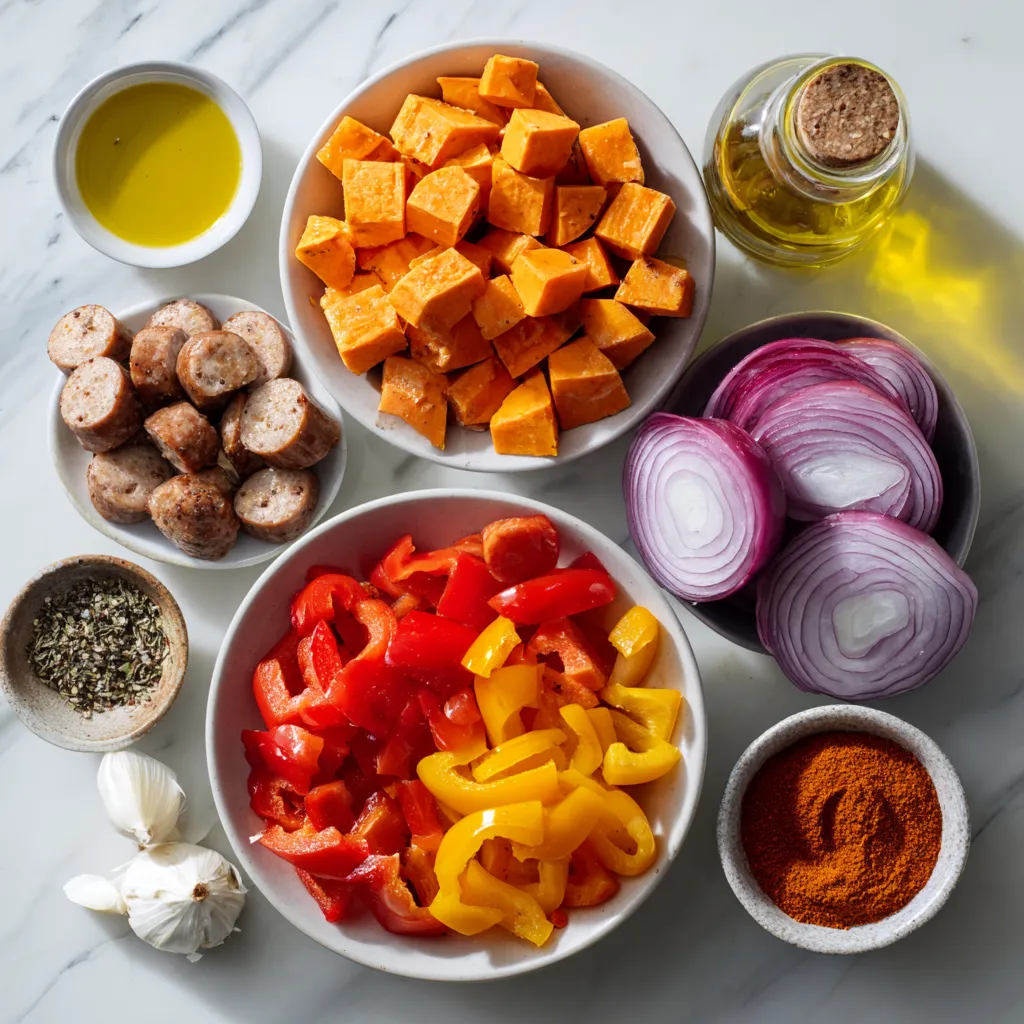 For this dish, you need to start with fresh ingredients. Use 2 medium sweet potatoes. Peel and cut them into 1-inch cubes for even cooking. Grab 1 pound of chicken or turkey sausage. Slice it into rounds for nice bites.