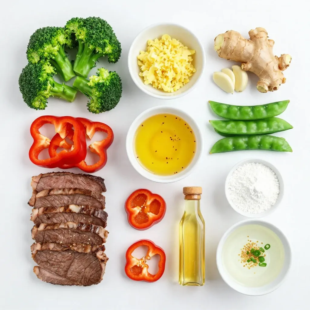 In this savory sesame ginger beef stir fry, the main ingredients create a balanced dish. The flank steak offers a tender and juicy base, while the ginger and garlic add a warm depth. Fresh vegetables like broccoli, bell pepper, and snap peas bring color and crunch.