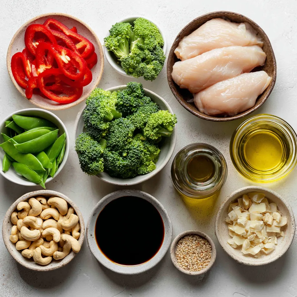 I use these ingredients to create a tasty meal. The chicken breast gives a good source of protein. I love how the cashews add a nice crunch. Fresh vegetables like broccoli, bell pepper, and snap peas add color and nutrients.