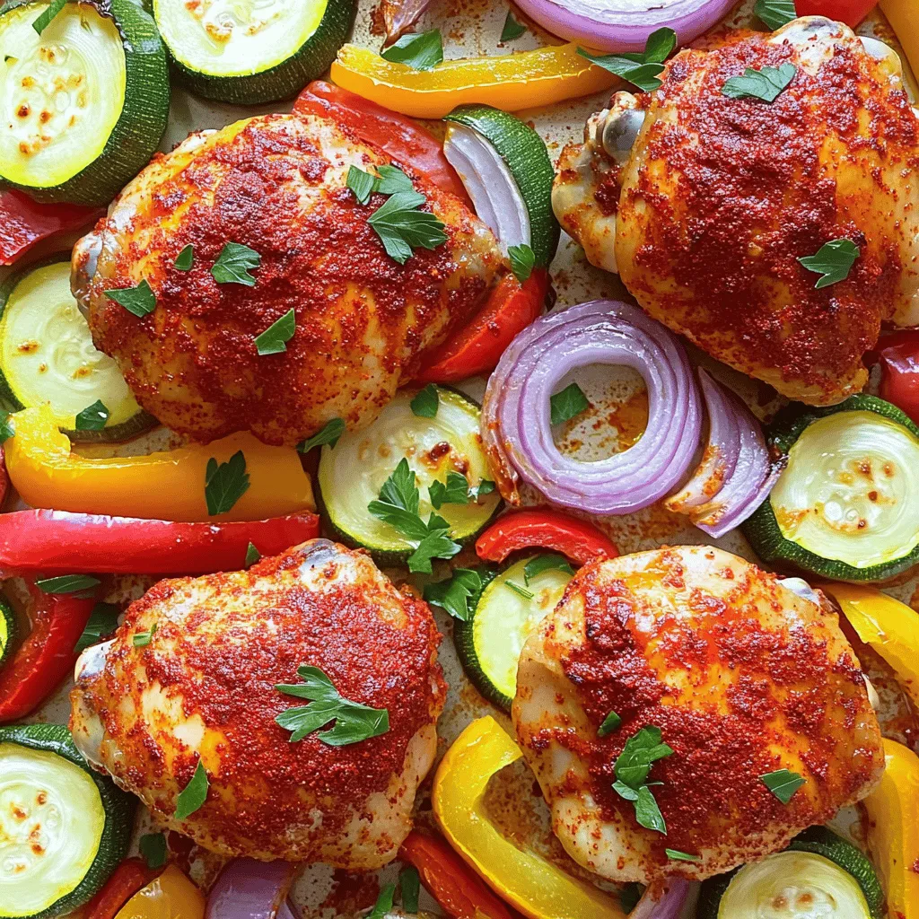 - 4 boneless, skinless chicken thighs - 2 tablespoons smoked paprika - 2 tablespoons extra virgin olive oil Chicken thighs are the star of this dish. They stay juicy and tender. Smoky paprika adds a warm flavor. This spice gives the chicken a beautiful color. Olive oil helps the seasoning stick and adds richness. - 1 red bell pepper, cut into thin strips - 1 yellow bell pepper, cut into thin strips - 1 medium purple onion, sliced into wedges - 2 medium zucchinis, sliced into half-moons For veggies, I like to choose colorful options. Red and yellow bell peppers bring sweetness. Purple onion adds a nice bite. Zucchini gives a lovely texture. Together, they create a vibrant medley that complements the chicken well. - 1 teaspoon garlic powder - 1 teaspoon onion powder - 1 teaspoon dried oregano - 1 teaspoon sea salt - ½ teaspoon freshly ground black pepper The seasoning mix brings all the flavors together. Garlic powder and onion powder enhance taste without overpowering. Dried oregano adds an earthy note. Salt and pepper round out the blend and elevate every bite. First, preheat your oven to 425°F (220°C). This ensures your chicken cooks evenly and gets that nice, crispy texture. While the oven heats up, gather your ingredients to make things easy. In a small mixing bowl, combine the spices. Mix together 2 tablespoons of smoked paprika, 1 teaspoon of garlic powder, 1 teaspoon of onion powder, 1 teaspoon of dried oregano, 1 teaspoon of sea salt, and ½ teaspoon of freshly ground black pepper. Stir well until the spices blend together nicely. Now, pat the chicken thighs dry using a paper towel. This helps the spice mixture stick better. Rub the spice mixture all over the chicken, covering every side. Next, in a large bowl, toss the sliced red and yellow bell peppers, purple onion wedges, and zucchini half-moons with 2 tablespoons of extra virgin olive oil. Make sure all the veggies are coated with oil and seasoning so they taste amazing. Take a large sheet pan and arrange the seasoned chicken thighs in the center. Surround them with the colorful vegetable mix. Spread everything out well. This helps the chicken and veggies cook evenly. Place the sheet pan in your preheated oven. Bake for about 25-30 minutes. You’ll know it’s done when the chicken reaches an internal temperature of 165°F (74°C) and the veggies are tender with caramelized edges. Once cooked, take the sheet pan out and let it rest for a few minutes. This lets the chicken juices settle. Before serving, sprinkle fresh parsley on top for a pop of color! To make sure the chicken is safe to eat, check its internal temperature. The chicken should reach 165°F (74°C). Use a meat thermometer for best results. This ensures it is juicy yet cooked through. When you remove it from the oven, let it rest for a few minutes. This helps keep the juices inside. For tasty veggies, start with fresh ingredients. Season them well with olive oil, salt, and pepper. I like to toss them in a bowl to coat evenly. You can also add herbs or lemon juice for extra zest. Bake until they are tender and slightly caramelized. This brings out their natural sweetness. Serving this dish is simple and fun. You can serve it right from the pan for a rustic look. Just sprinkle fresh parsley on top for color. If you want a fancier feel, use a large platter. Arrange the chicken and veggies nicely, and add more parsley to brighten it up. Both ways look great and taste amazing! {{image_4}} You can change the protein in this dish easily. If you want a lighter option, use chicken breasts. They cook fast and stay juicy. For a plant-based choice, try tofu. Just press and cube it before adding spices. Shrimp is another great option. It cooks quickly and adds a nice flavor. Feel free to switch up the veggies. Use seasonal produce for the best taste. For a spring dish, add asparagus or snap peas. In summer, corn or cherry tomatoes work well. You can also use your favorite veggies. Just make sure they cook at the same rate as the chicken. If you like a kick, add cayenne pepper. Just a pinch can elevate the flavor. You can also play with the smoky paprika. Try sweet paprika for a milder taste. Mix in some chili powder for a different flavor profile. Adjust the spices to fit your taste! After enjoying your smoky paprika chicken and veggies, let the dish cool completely. This step is key. Once cooled, transfer the chicken and veggies to an airtight container. It helps keep the flavors fresh. Store the container in the fridge. This way, you can enjoy your meal for up to three days. When reheating, the goal is to keep the chicken juicy. Preheat your oven to 350°F (175°C). Place the chicken and veggies on a baking sheet. Cover them with foil to keep moisture in. Heat for about 15-20 minutes. Check that the chicken is warm all the way through. This method helps preserve the smoky flavor. If you want to save some for later, freezing is a great option. First, let the dish cool completely. Then, portion the chicken and veggies into freezer-safe bags or containers. Remove as much air as possible before sealing. Label with the date. You can freeze it for up to three months. When you’re ready to eat, thaw in the fridge overnight. Reheat in the oven for a tasty meal. Yes, you can use bone-in chicken. Bone-in chicken will take longer to cook. I recommend adding about 10 to 15 minutes to the baking time. Always check that the chicken reaches 165°F (74°C) for safety. This recipe is naturally gluten-free. Just make sure the spices you use do not contain any gluten. Most spices are safe, but always check the labels. Many sides go well with smoky paprika chicken. Here are some ideas: - Roasted potatoes - Steamed broccoli - A fresh green salad - Quinoa or rice These sides bring balance to the meal and add more color. Adjust cooking time based on size. For smaller pieces, reduce the time by about 5 to 10 minutes. For larger pieces, increase the time by 10 to 15 minutes. Always check for d
