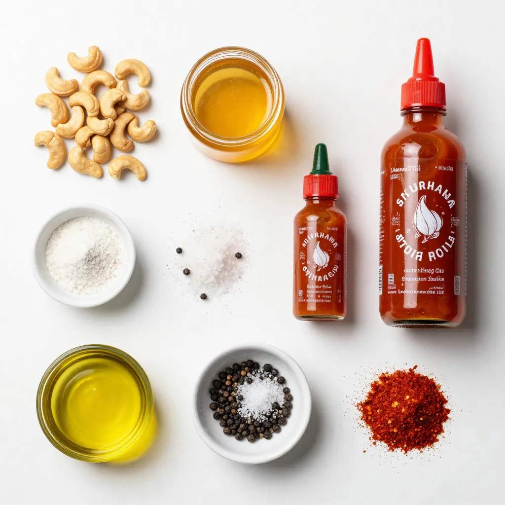 - 2 cups raw cashews - 2 tablespoons honey - 2 tablespoons Sriracha sauce - 1 tablespoon olive oil - 1 teaspoon garlic powder - 1/2 teaspoon salt - 1/4 teaspoon black pepper - 1/4 teaspoon smoked paprika (optional) To make Sriracha honey roasted cashews, start with raw cashews. You need about 2 cups. The raw nuts soak up flavors well and roast nicely. Next, you’ll add a sweet and spicy mix with honey and Sriracha sauce. Use 2 tablespoons of each to get that perfect balance. For extra taste, you can add garlic powder, salt, black pepper, and smoked paprika. Garlic powder gives a nice depth. The salt enhances flavor, while black pepper adds a bit of heat. Smoked paprika brings a subtle smoky touch; it’s optional but highly recommended. Finally, use olive oil to help everything stick together. Just 1 tablespoon works great. This oil also helps the nuts roast perfectly and adds richness to the flavor. {{ingredient_image_2}} First, preheat your oven to 350°F (175°C). This step warms the oven for even cooking. While it heats up, line a baking sheet with parchment paper. This will stop the cashews from sticking and make clean-up a breeze. Next, grab a large mixing bowl. In it, combine 2 tablespoons of honey, 2 tablespoons of Sriracha sauce, and 1 tablespoon of olive oil. Add 1 teaspoon of garlic powder, 1/2 teaspoon of salt, 1/4 teaspoon of black pepper, and 1/4 teaspoon of smoked paprika if you want an extra kick. Whisk or stir until the mix is smooth and well combined. Now, it’s time to add the cashews. Pour 2 cups of raw cashews into the bowl with the sauce. Toss them gently to coat each nut in the flavorful mix. Once coated, transfer the cashews to the baking sheet. Spread them out in a single layer, so they roast evenly. Place the baking sheet in your preheated oven. Roast the cashews for 15-20 minutes. Remember to stir them every 5 minutes. This helps them roast evenly and keeps them from burning. When they turn golden brown and fill your kitchen with a tasty aroma, they’re ready. Take the sheet out and let the cashews cool. They will get crispier as they cool down. Enjoy your spicy-sweet snack! To get that perfect crunch, start by spreading the cashews in a single layer on your baking sheet. This helps them roast evenly. Stir them every five minutes while they cook. This keeps them from burning and helps them crisp up nicely. After roasting, let them cool on the baking sheet. They will become even crunchier as they cool down. You can make these cashews your own! If you like more heat, add extra Sriracha. For a sweeter taste, add a bit more honey. Want a different flavor? Try adding some cayenne pepper or even a dash of lime juice. Taste the sauce before coating the cashews. Adjust it until it matches your taste. Cleaning up can be easy with parchment paper. It helps prevent sticking and makes for quick cleanup. After roasting, let the baking sheet cool. Then, simply roll up the parchment and throw it away. If any sticky bits stay stuck, soak the baking sheet in warm, soapy water for a bit. This will help loosen the remnants. Pro Tips Keep an Eye on Roasting: Cashews can go from perfectly roasted to burnt in a matter of minutes. Make sure to stir them every 5 minutes to ensure even cooking. Adjust the Spice Level: If you prefer a milder snack, reduce the amount of Sriracha or substitute it with a milder hot sauce. You can always add more later! Storage Tips: Once cooled, store the cashews in an airtight container to keep them fresh and crunchy. They can last up to two weeks at room temperature. Experiment with Flavors: Feel free to add other spices or nuts to the mix. A sprinkle of cayenne, or even some herbs like rosemary, can elevate the flavor further! {{image_4}} You can play with the sweetness and spice levels in this recipe. Try using maple syrup instead of honey for a different flavor. If you want more heat, add an extra tablespoon of Sriracha. For a milder snack, reduce the Sriracha to one tablespoon. Mixing in a little brown sugar can also add a nice caramel flavor. This balance creates a tasty mix that many will love. If you want to switch things up, consider using peanuts or almonds. Peanuts provide a classic crunch and a rich flavor. Almonds add a nice nuttiness that pairs well with the sauce. You can also use mixed nuts for a fun variety. Just remember to adjust the roasting time, as different nuts may cook faster or slower than cashews. Herbs can enhance these cashews in great ways. Try adding a teaspoon of dried thyme or rosemary for an earthy twist. You could also sprinkle in a bit of cayenne pepper for extra heat. For a touch of sweetness, consider mixing in cinnamon. These additions let you customize the flavor to fit your taste. To keep your Sriracha honey roasted cashews fresh, store them in an airtight container. Glass jars or plastic containers work well. Make sure the lid is tight. This keeps air and moisture out, which helps maintain crunch. If you have a lot, consider dividing them into smaller portions. This way, you only open what you need. Roasted cashews can last up to two weeks if stored correctly. Store them in a cool, dry place, away from sunlight. If you want to keep them longer, you can freeze them. Just place them in a freezer-safe bag. They can stay fresh for up to three months in the freezer. When ready to eat, let them thaw at room temperature. If your cashews lose their crunch, don't worry! You can easily recrisp them. Spread the cashews on a baking sheet. Preheat your oven to 350°F (175°C). Roast them for about 5-10 minutes. Keep an eye on them to avoid burning. Once they cool, they will be crispy again, ready for snacking! Yes, you can use roasted cashews. However, the flavor will change. Roasted cashews may not absorb the sauce as well. This can affect the taste and crunch. If you choose roasted, watch the roasting time closely. They may need less time in the oven. If you lack Sriracha, use another hot sauce. Choose one with a similar 
