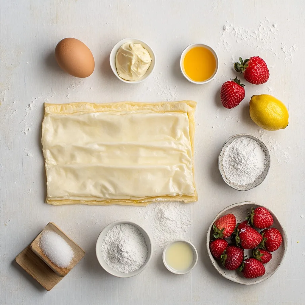 Gathering these ingredients is easy. You start with puff pastry as the base. I love how it puffs up in the oven. Next, use cream cheese for that rich, creamy filling. Fresh strawberries add a sweet touch, bursting with flavor.