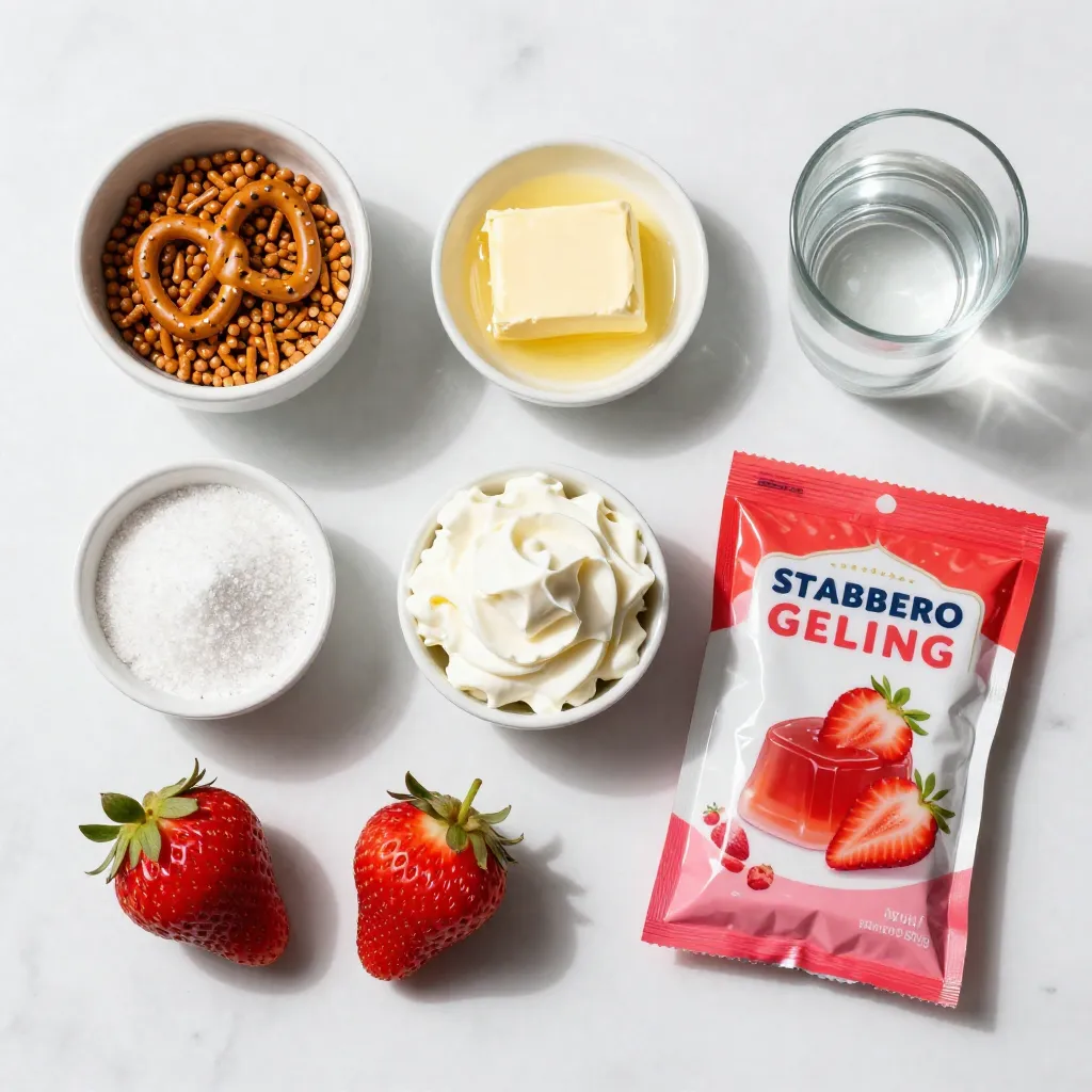 Each ingredient plays a special role in this dessert. The pretzels create a salty and crunchy crust. Sugar adds sweetness and helps bind. Butter gives richness and flavor. Cream cheese brings a smooth, creamy layer. Powdered sugar sweetens that layer perfectly. Whipped topping adds lightness and volume. The gelatin helps the dessert set, while fresh strawberries add natural sweetness and a burst of flavor.