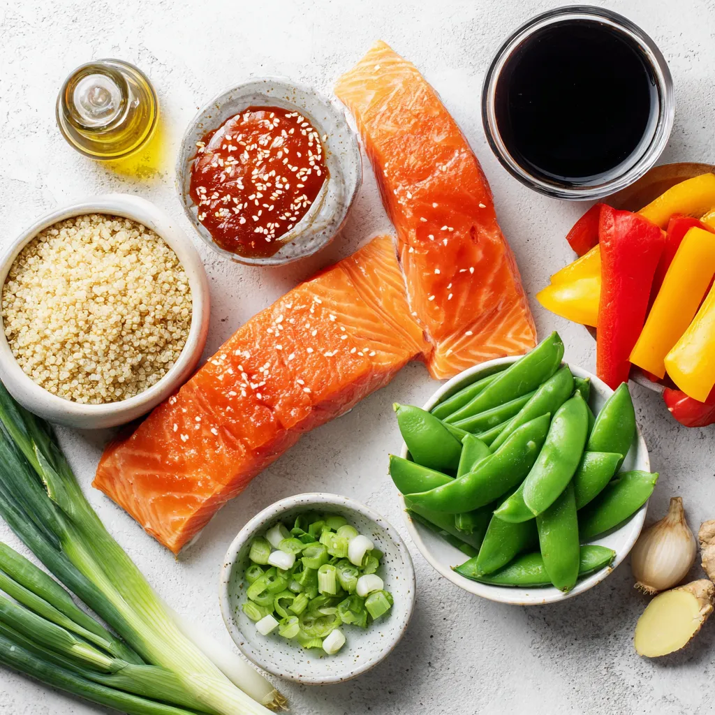 These ingredients combine to create a meal that is both tasty and healthy. The salmon provides protein and omega-3 fatty acids. Quinoa adds fiber and nutrients. The colorful peppers and snap peas bring freshness and crunch.