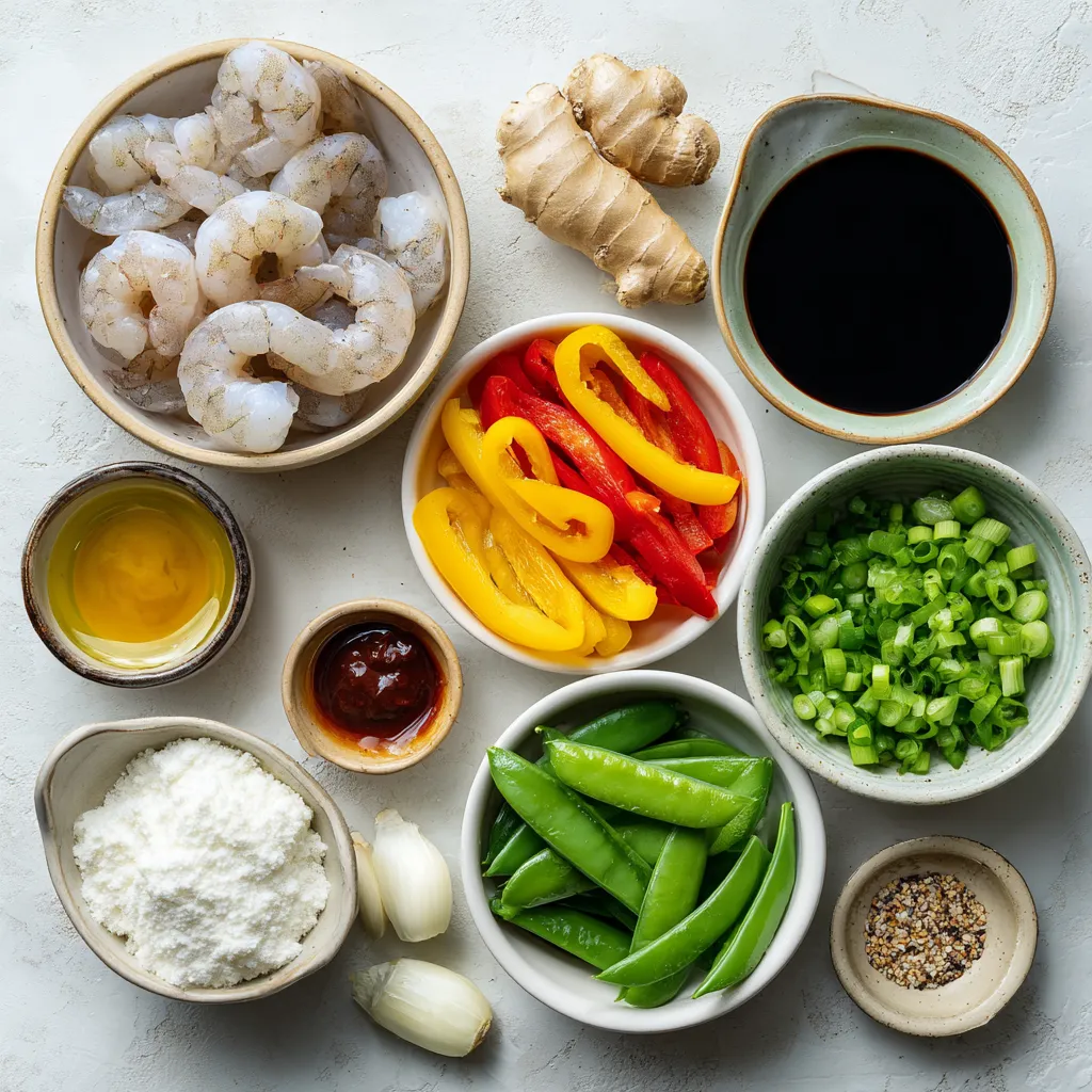 The key ingredients in this dish are the shrimp and vegetables. The shrimp gives a fresh taste. The cornstarch creates a nice crunch. I use colorful bell peppers and snap peas for great flavor and texture. Sweet chili sauce brings a delicious sweetness. Soy sauce and rice vinegar balance it all out.
