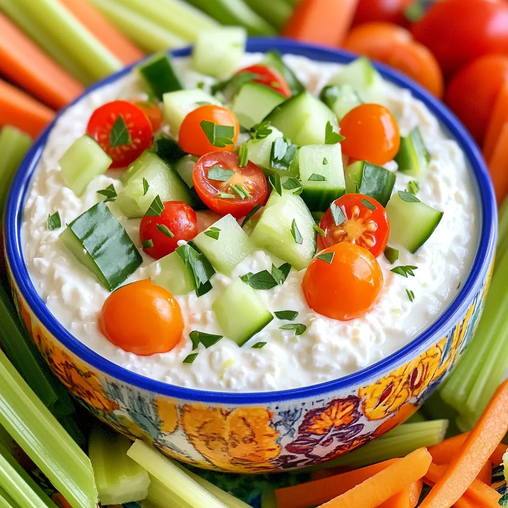 - 1 cup creamy cottage cheese - 1/2 cup smooth plain Greek yogurt - 1 tablespoon ranch seasoning mix - 1/4 cup fresh cucumber, diced - 1/4 cup bell pepper, finely chopped - 1/4 cup cherry tomatoes, quartered - 2 green onions, finely sliced - 1 tablespoon fresh parsley, finely chopped - Optional: 1 teaspoon lemon juice - Salt and pepper to taste The base of this dip is creamy cottage cheese and smooth Greek yogurt. This mix gives your dip a rich texture. Then, you add ranch seasoning to give it a tasty kick. Fresh vegetables like cucumber, bell pepper, and cherry tomatoes add crunch and color. Green onions and parsley bring brightness to the dish. You can also add lemon juice for extra zest. Finally, don’t forget the salt and pepper to make everything pop! 1. Start by placing the cottage cheese and Greek yogurt in a medium bowl. 2. Use a fork or whisk to mix them well. You want a smooth and creamy blend. 3. Next, sprinkle in the ranch seasoning mix. Fold it into the cheese-yogurt mix. 4. Stir until the seasoning spreads evenly throughout. Your dip will start to taste great! 5. Now, gently add the diced cucumber, chopped bell pepper, quartered cherry tomatoes, and sliced green onions. 6. Carefully mix these colorful veggies in without mashing them. You want to keep the crunch! 7. For a zesty kick, stir in the lemon juice, salt, and pepper to taste. 8. Mix again to ensure every bite is full of flavor. 9. Cover the bowl with plastic wrap or a lid. Put it in the fridge to chill for at least 30 minutes. 10. Chilling helps the flavors mix well and taste better. 11. When you’re ready to serve, stir the dip gently. Taste it and adjust the salt and pepper if needed. This dip is simple to make and full of fresh flavors. Enjoy it with crunchy veggies or pita chips! To get that creamy dip, start by blending the cottage cheese and Greek yogurt well. Use a fork or a whisk. Mix them until smooth. This step is key for the best texture. When you add the vegetables, fold them in gently. Use a spatula to mix without smashing the veggies. You want to keep that crunch and color. Letting the dip chill is very important. Chill it for at least 30 minutes. This time helps all the flavors blend nicely. Pair your dip with fresh vegetable sticks. Carrots, celery, and bell peppers work great. You can also serve it with crispy pita chips. For a nice look, use a bright bowl for the dip. Surround it with colorful veggies. This makes your spread fun and eye-catching! {{image_4}} You can swap out vegetables in this dip. Try using shredded carrots or chopped radishes. You can also add some diced celery for crunch. Each veggie adds its own flavor and texture. For the ranch seasoning, you have two choices. You can buy it in the store or make it at home. Homemade ranch seasoning lets you control the flavors. Mix dried herbs like dill, parsley, and garlic powder for a personal touch. Cheese is key for creaminess. While I use cottage cheese, you can experiment with others. Cream cheese or ricotta can add a new twist. Just remember to blend well for smoothness. Want more flavor? You can add spices. Try a pinch of cayenne pepper for heat. Paprika can give it a smoky taste. Fresh herbs like dill or chives can also bring extra freshness. If you want a heartier dip, add protein. Chopped cooked chicken or turkey can work well. You could even mix in some black beans for a different flavor. These additions make the dip more filling and satisfying. To keep your Veggie Ranch Cottage Cheese Dip fresh, use an airtight container. Glass or plastic containers work well. Make sure the lid seals tightly to keep air out. Store the dip in the fridge. It stays good for about 3 to 5 days. Always check for any signs of spoilage before enjoying. If your dip becomes thick after chilling, don’t worry! You can revive it easily. Just add a splash of milk or more yogurt. Mix it well until you reach your desired creaminess. Stir gently to keep the veggies intact. Avoid using heat, as it may change the dip's texture. Enjoy your fresh dip anytime! You can store this dip for up to five days in the fridge. I recommend using an airtight container. This keeps it fresh and tasty. Just give it a good stir before serving again. Yes, you can use low-fat cottage cheese and Greek yogurt. The dip will still taste great. Just remember, the texture might be a bit different. It may not be as creamy, but it will still be delicious. A good serving size is about 1/4 cup per person. This amount allows everyone to enjoy it without running out too soon. For a larger crowd, consider making a double batch. Everyone loves a tasty dip! Absolutely! You can make this dip a day before your event. Just store it in the fridge until you are ready to serve. This allows the flavors to blend better, making it even more delicious. In this post, I covered how to make a delicious Veggie Ranch Cottage Cheese Dip. We discussed the essential ingredients, step-by-step preparation, and tips for perfect texture. I also shared variations and storage tips to help you enjoy this dip longer. Remember, experimenting with flavors and textures can elevate your dip. Enjoy making it for your next gathering!